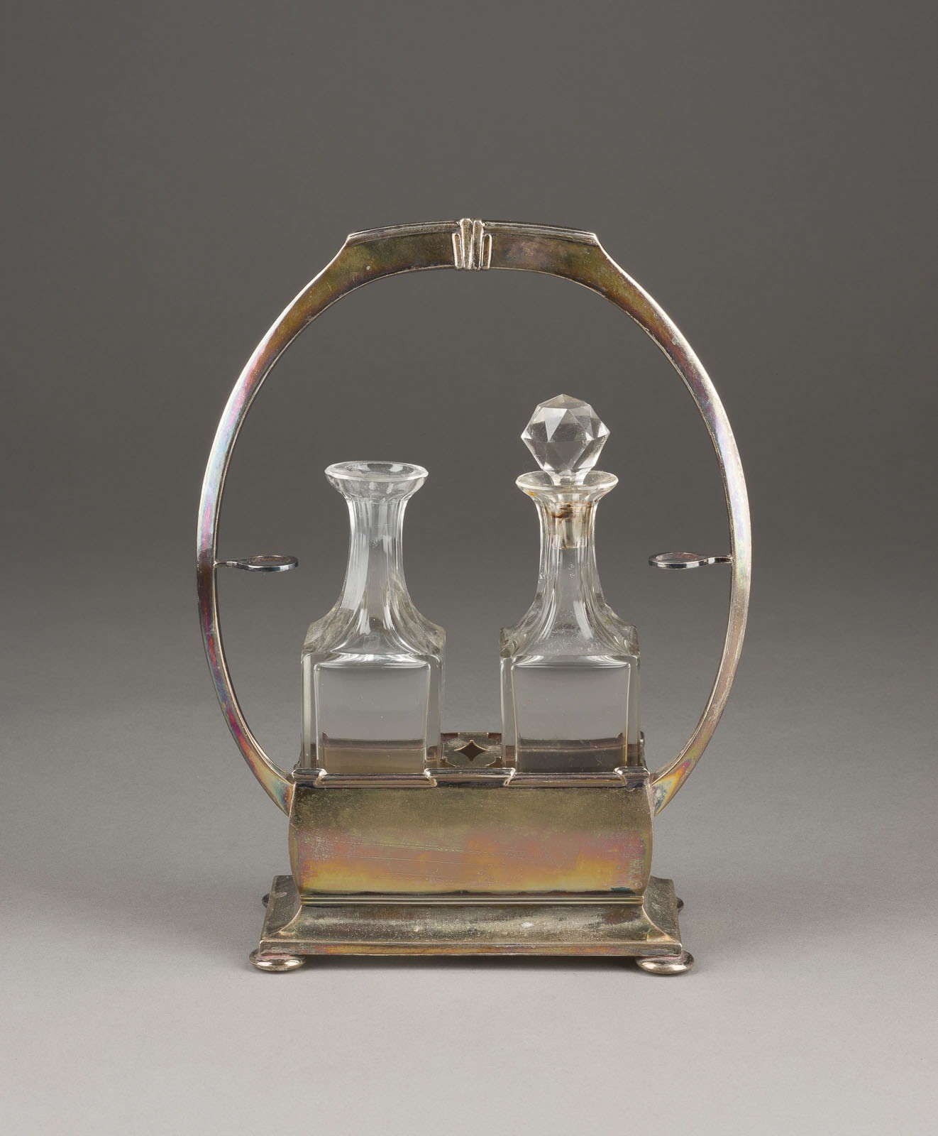 800er Silber. H. 24,5 cm, 197 g (Silber). Punziert mit Feingehaltsangabe '800' und Herstellermarken. Verschluss einer Flasche fehlt.