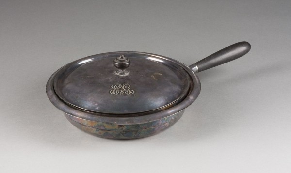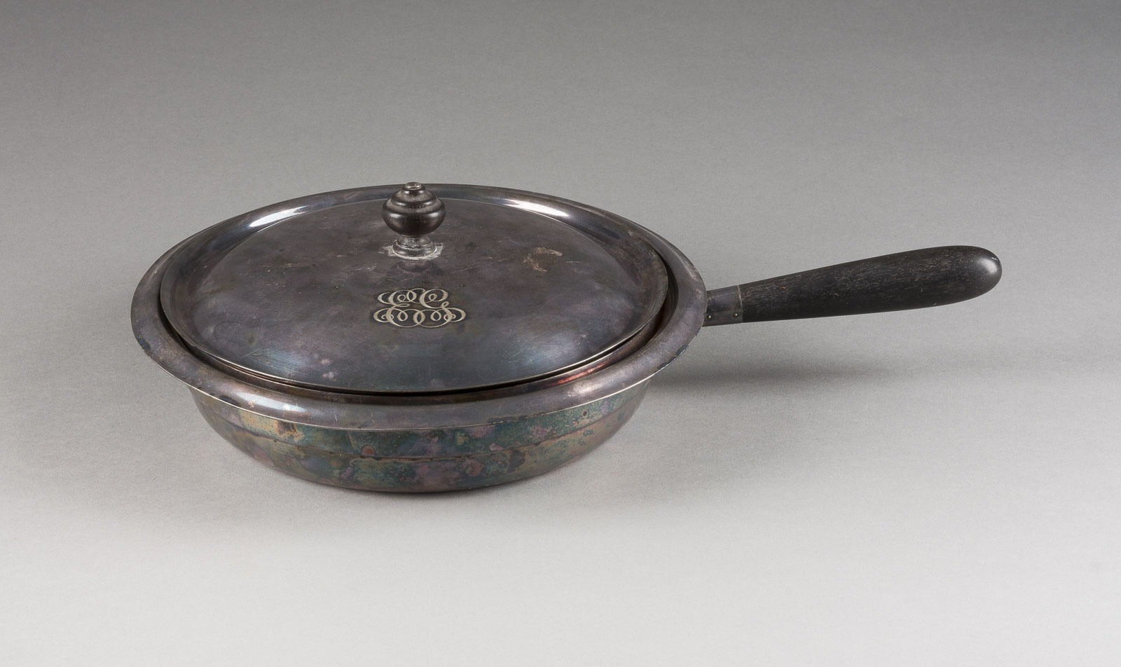 Versilbert, ebonisiertes Holz. D. 22 cm, Gew. 1407 g. Punziert mit Firmenmarke 'Tiffany & Co/Markes', 'SILVER-SOLDERED-E.P.' und Modellnr. '1620 260', 'Y'. Besitzermonogramm. Min. Oberflächenkratzer.