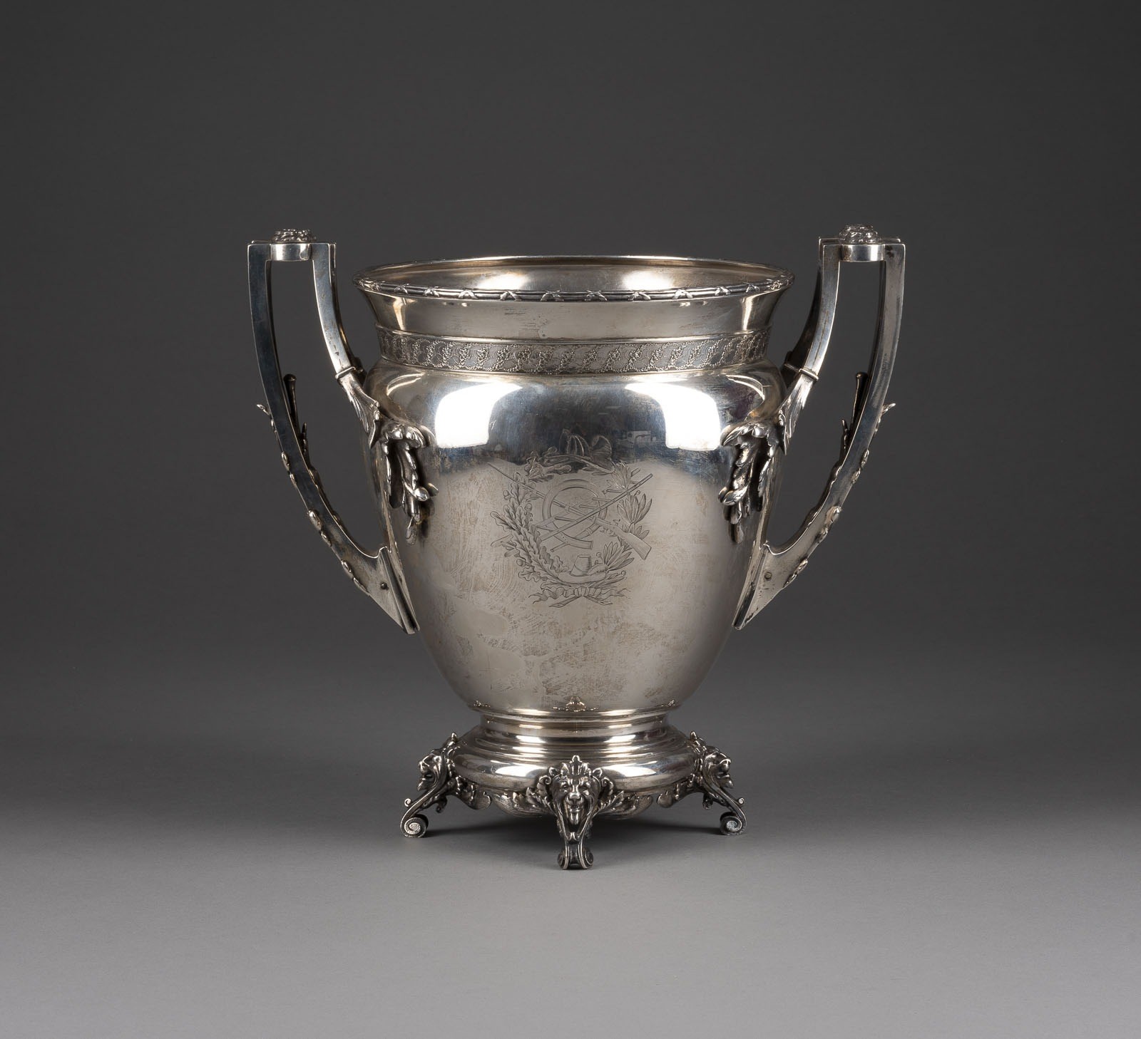 mit Löwenköpfen. Wandung ist verziert mit einem Wappen in Form eines Lorbeerkranzes mit