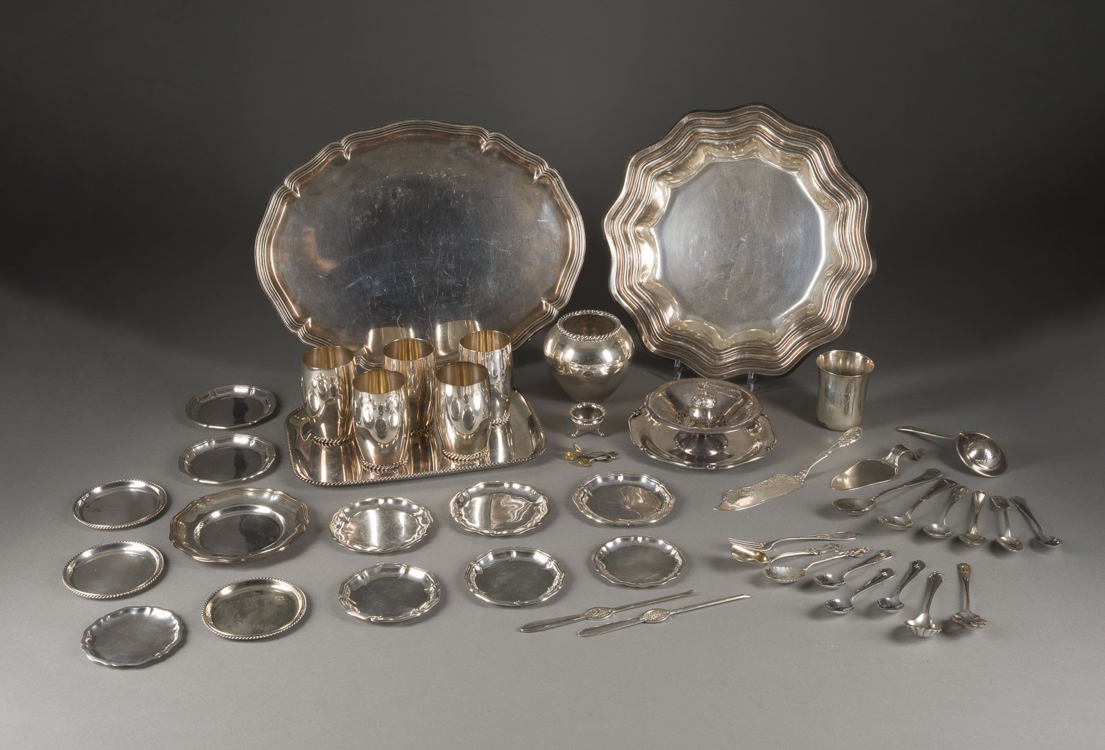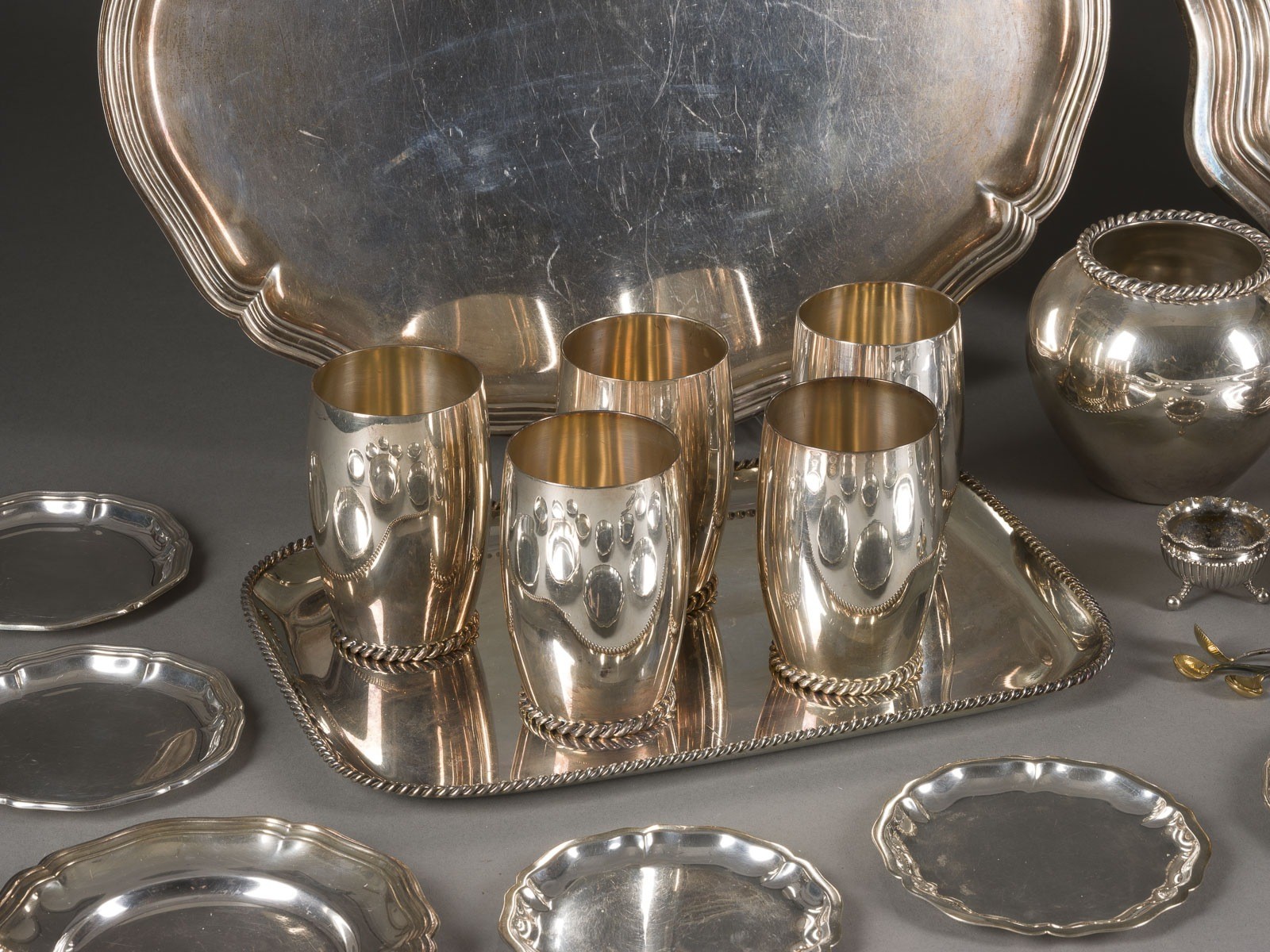 800/835/925er Silber. Ges.-Gew. 4812 g. Punziert mit Halbmond, Krone, Feingehalt '925', Feingehalt. Bestehend aus: 5 Bechern mit 12 Untersetzern, 1 Vase, 4 Tabletts (1 Tablett ohne Punze), 1
