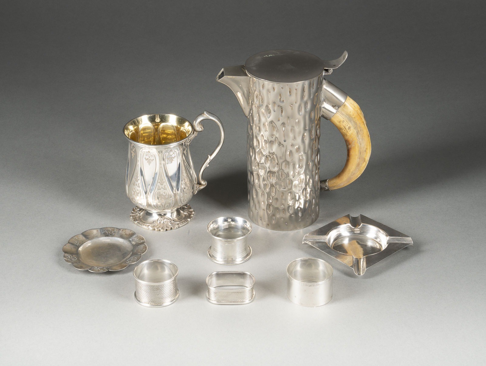 Silber, teilw. vergoldet. Ges.-Gew. 403 g., H. 13 cm. Teils punziert mit Garantie- und Herstellermarken sowie mit Feingehaltsangaben '0,925' (undeutlich). Bestehend aus: 4 Servettenringen, 1 Ascherbecher, 1 kl. Schale, 1 Krug.