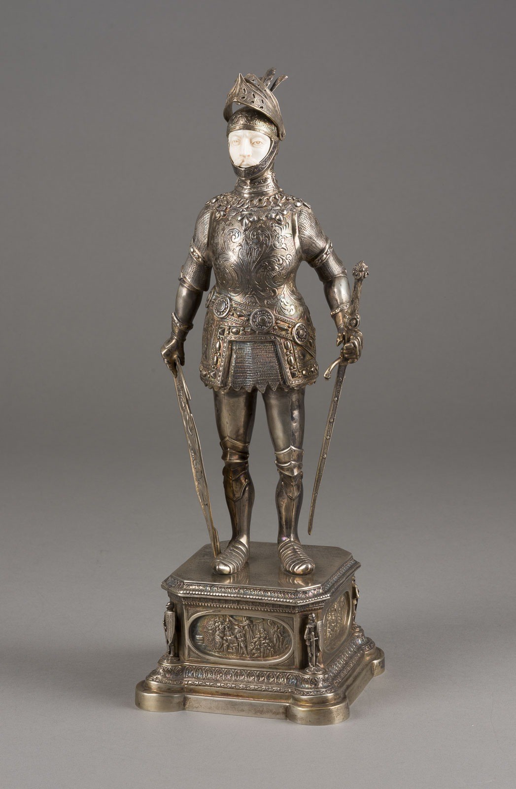 800er Silber, part. vergoldet, getrieben, partiell ziseliert, Gesicht aus Elfenbein geschnitzt. Gew. 1778 g, H. 43,2 cm. Punziert mit Halbmond, Krone, Feingehaltsangabe '800', Firmensignet (JK mit Schwan). Stilistisch orientiert sich die Figur an den Bronzeskulpturen am Maximiliansgrab in der