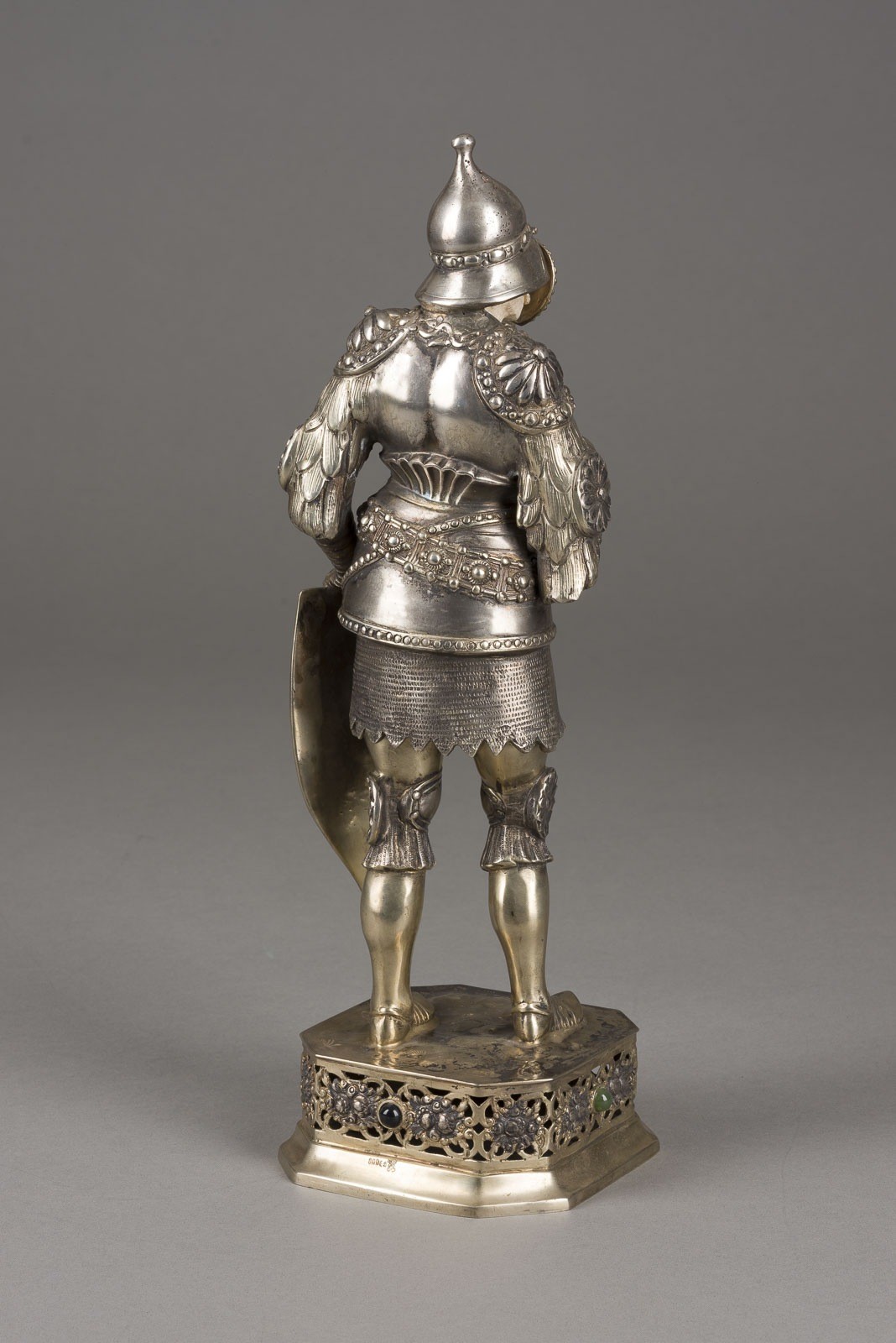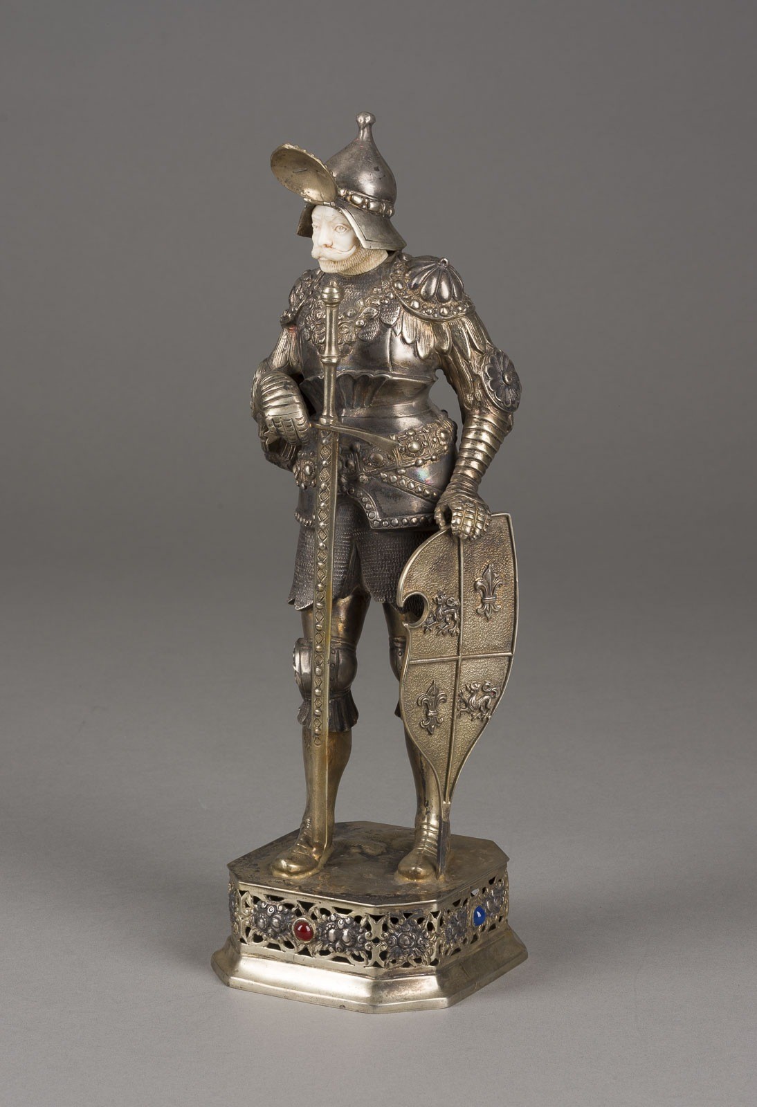 800er Silber, getrieben, partiell ziseliert, Gesicht aus Elfenbein geschnitzt, 4 farbige Cabochons. Gew. 1475 g, H. 34,7 cm. Punziert mit Halbmond, Krone, Feingehaltsangabe '800', Firmensignet 'bekröntes R'. Stilistisch orientiert sich die Figur an den Bronzeskulpturen am Maximiliansgrab in der