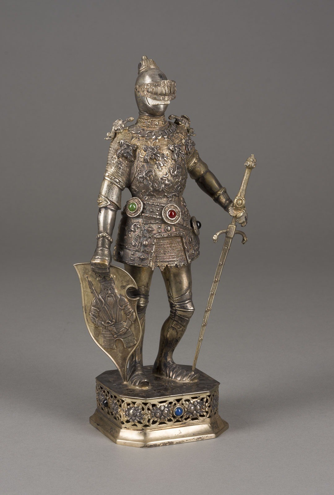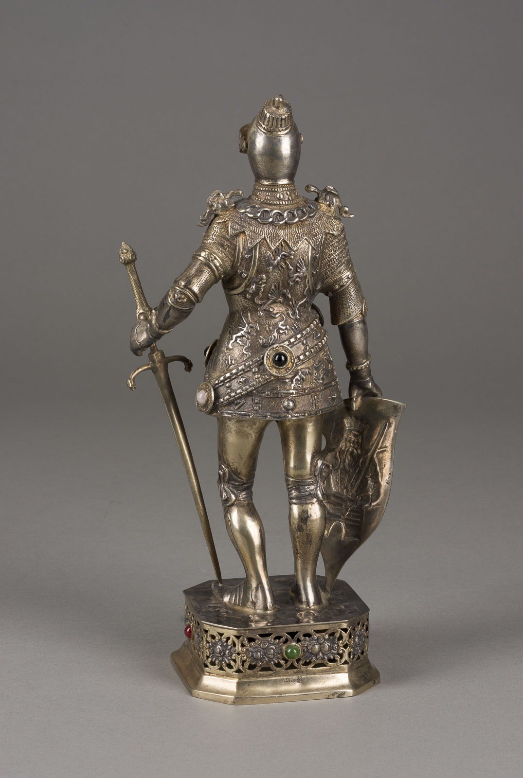 800er Silber, getrieben, partiell ziseliert, Gesicht aus Elfenbein geschnitzt, 8 farbige Cabochons. Gew. 1335 g, H. 34,5 cm. Punziert mit Halbmond, Krone, Feingehaltsangabe '800', Firmensignet (bekröntes R). Stilistisch orientiert sich die Figur an den Bronzeskulpturen am Maximiliansgrab in der