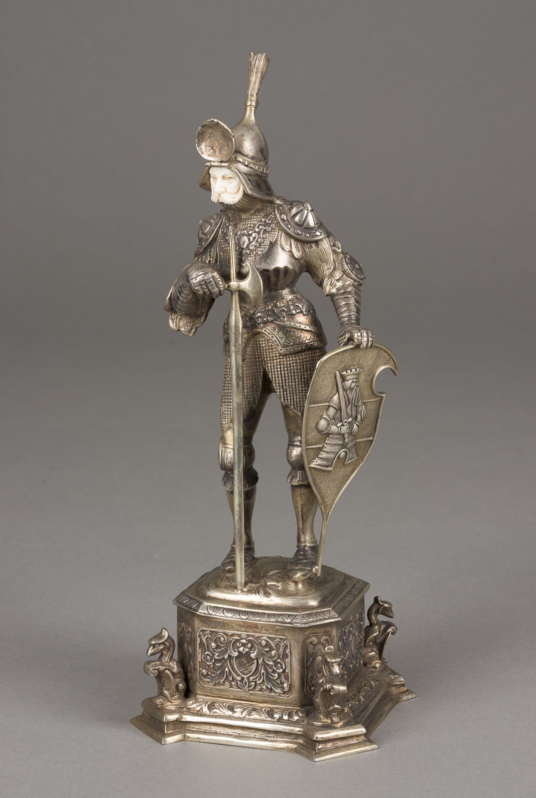 800er Silber, getrieben, partiell ziseliert, Gesicht aus Elfenbein geschnitzt. Gew. 840 g, H. 29,5 cm. Punziert mit Halbmond, Krone, Feingehaltsangabe '800', Firmensignet 'Efes'. Stilistisch orientiert sich die Figur an den Bronzeskulpturen am Maximiliansgrab in der