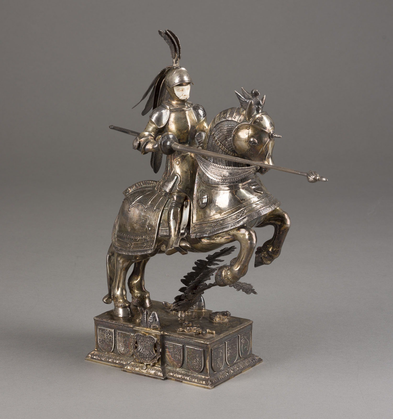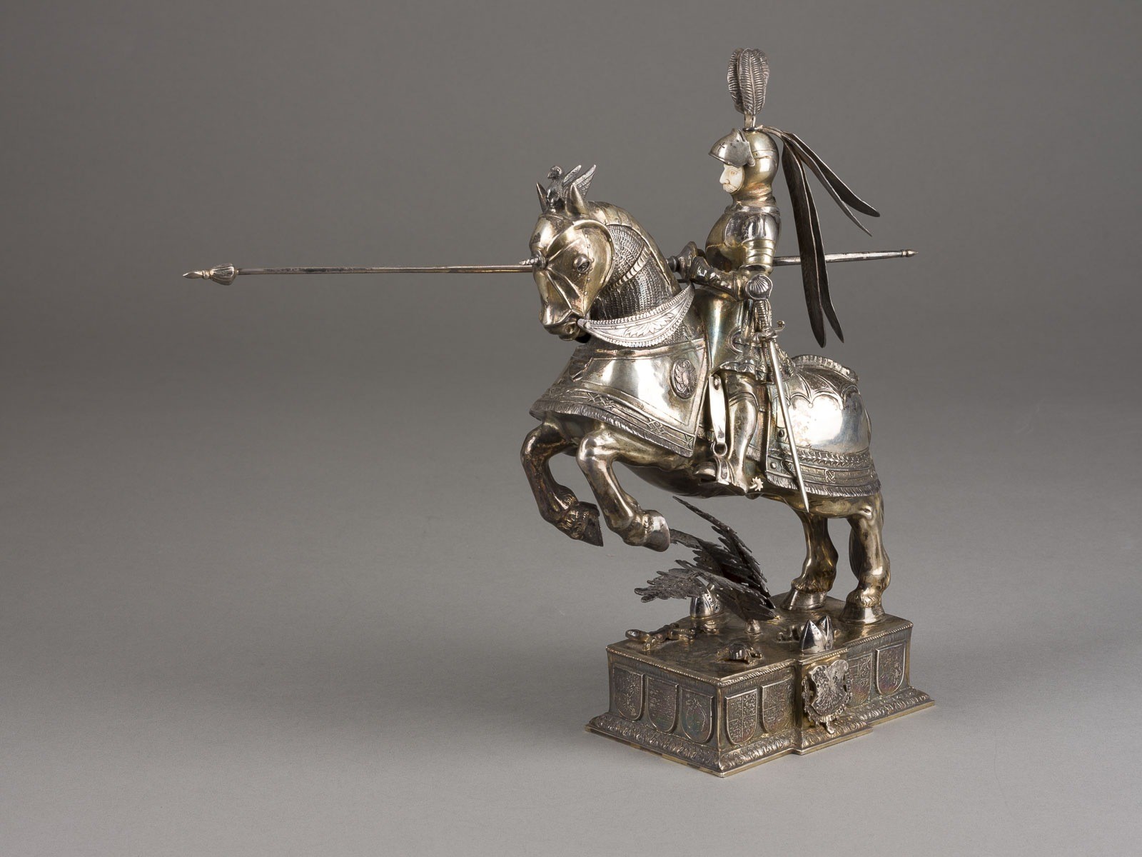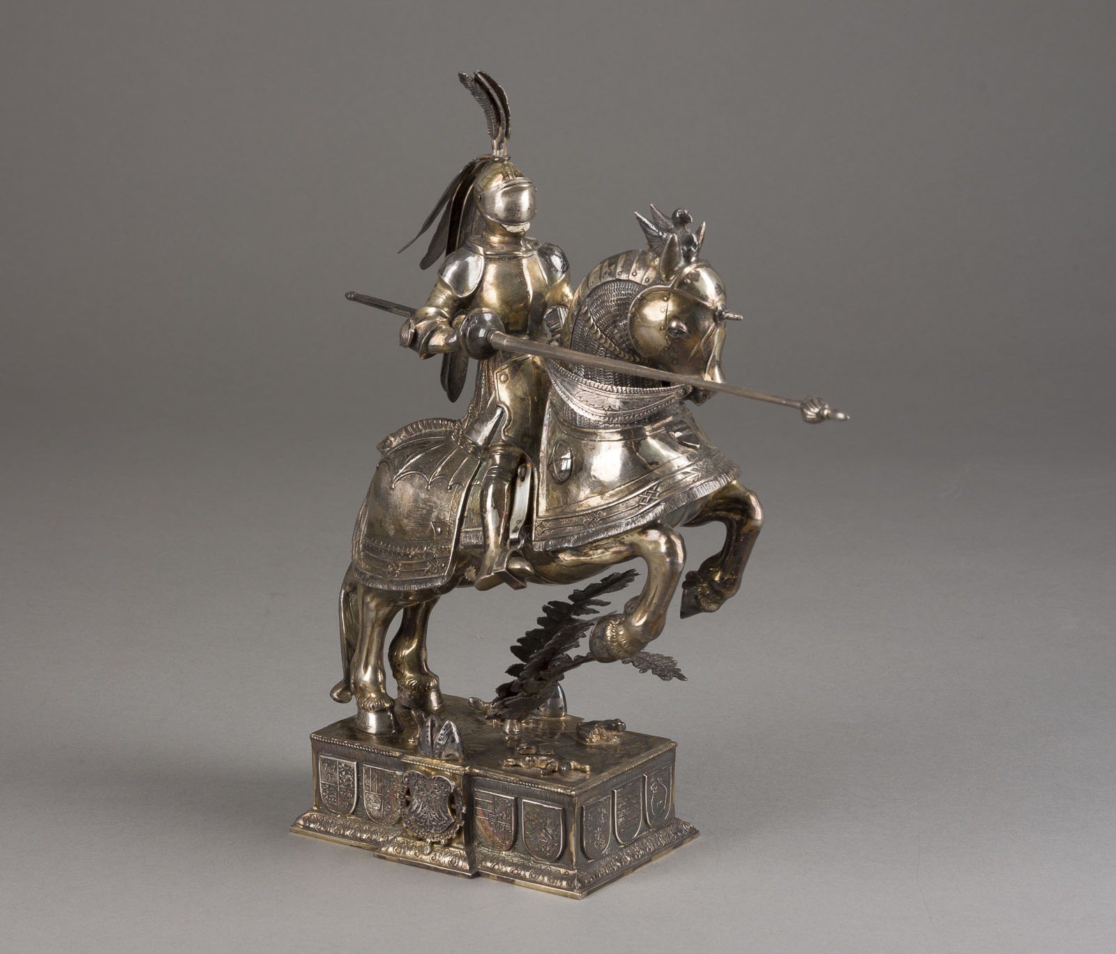 800er Silber, part. vergoldet, getrieben, partiell ziseliert, Gesicht aus Elfenbein geschnitzt. Gew. 1969 g, H. 33,3 cm. Punziert mit Halbmond, Krone, Feingehaltsangabe '800', Firmensignet. Stilistisch orientiert sich der reitende Turnierritter wohl an Illustrationen in Albrecht