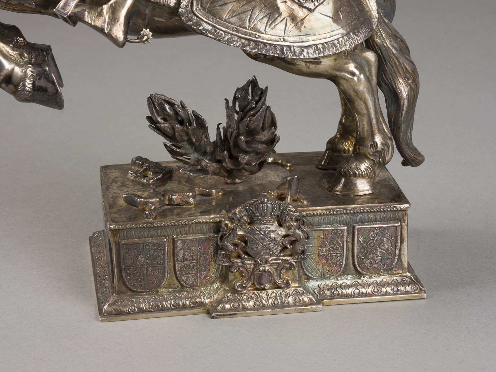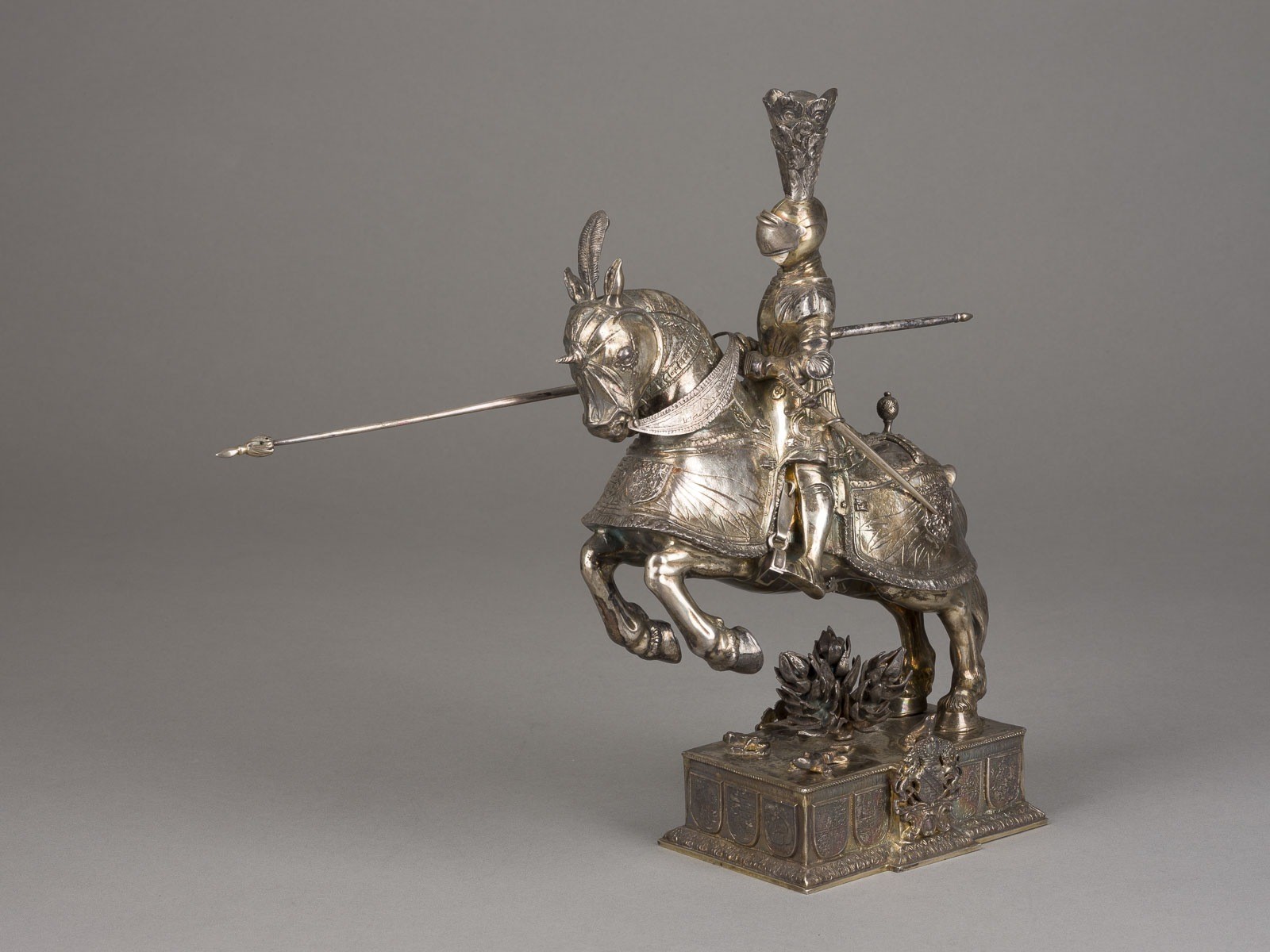 Silber, Gesicht aus Elfenbein geschnitzt. Gew. 1967 g, H. 33,2 cm. Punziert mit gotisch "N" im Wappenschild. Stilistisch orientieren sich die reitenden Turnierritter wohl an Illustrationen in