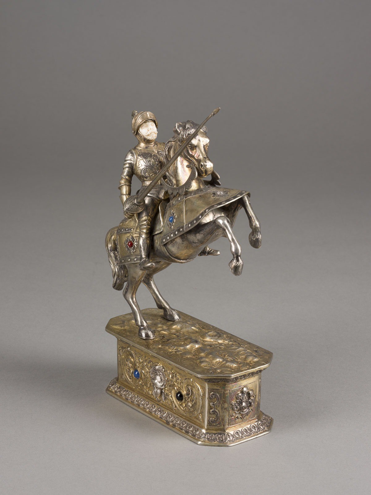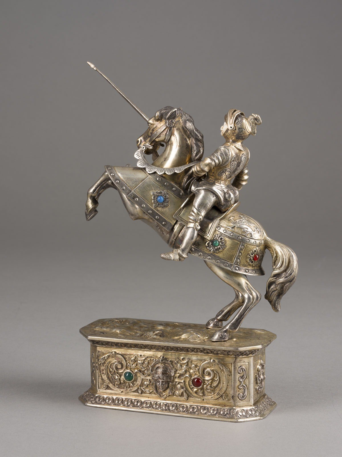 800er Silber, part. vergoldet, getrieben, partiell ziseliert, Gesicht aus Elfenbein geschnitzt, 11 farbige Cabochons. Gew. 1419 g, H. 25,5 cm. Punziert mit Halbmond, Krone, Feingehaltsangabe '800', Fantasiemarke 'bekrönte Lilie'. Stilistisch orientiert sich der reitende Turnierritter wohl an Illustrationen in Albrecht