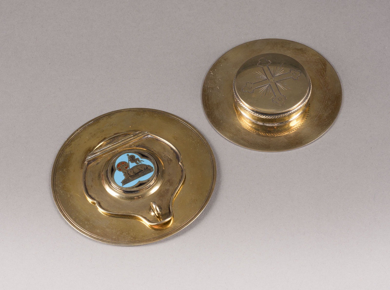 Silber, vergoldet, emailliert. Ges. Gew. 168 g. Punziert mit Halbmond, Krone, Dianakopfmarke, Feingehalt '800', Meistermarke 'AK'.