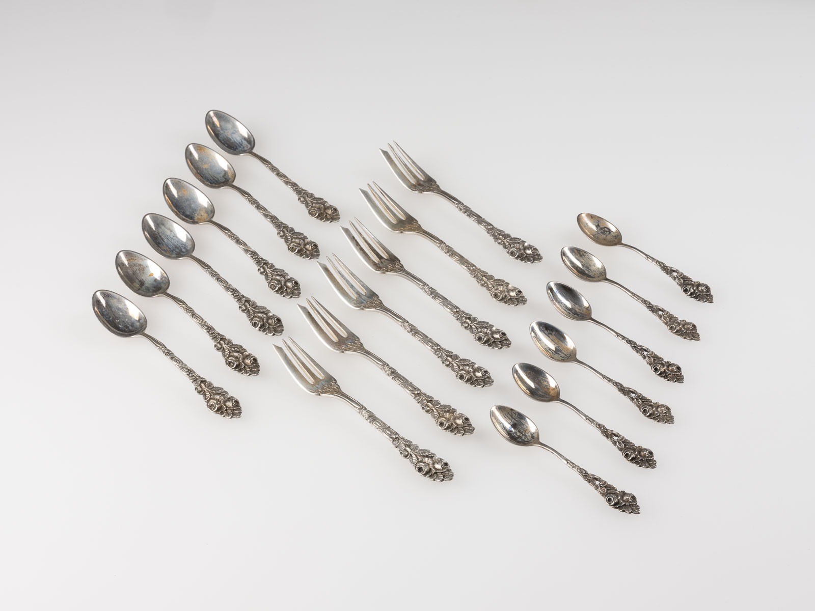 ZWÖLF KLEINE LÖFFEL UND SECHS KLEINE GABELN IN ETUIS