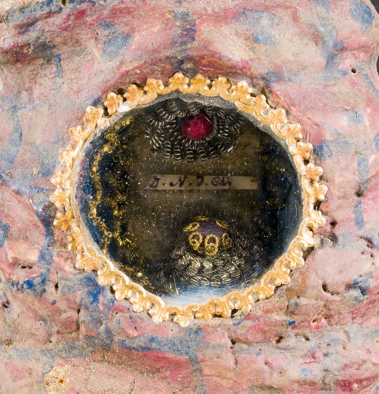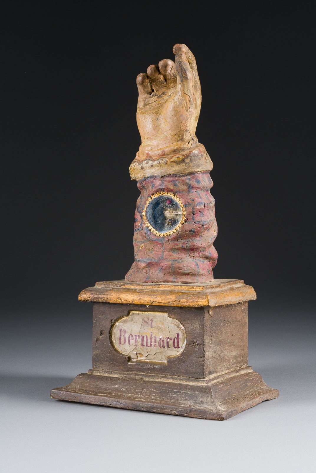 Holz, rundansichtig geschnitzt, vergoldet, polychrom gefasst, mittig eingelassenes Reliquienfenster mit Glasabdeckung, auf einem Sockel. H. 38,5, B. 22, T. 13 cm, Gew. ca. 1,54kg. Vorderseitig bezeichnet 'St. Bernhard'. Armreliquiar in Form eines segnend erhobenen Unterarms, des vermutlich Bernhard von