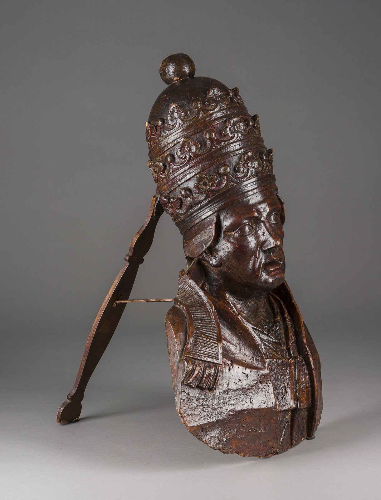 Holz, plastisch geschnitzt, dunkel gebeizt, rückseitig Aufsteller. H. 61, B. 40, T. 18 cm, Gew. ca.. Rückseitig bez. 'Provient du Cardinal de Falloux'. Part. best, besch., Verso Anobienbefall.