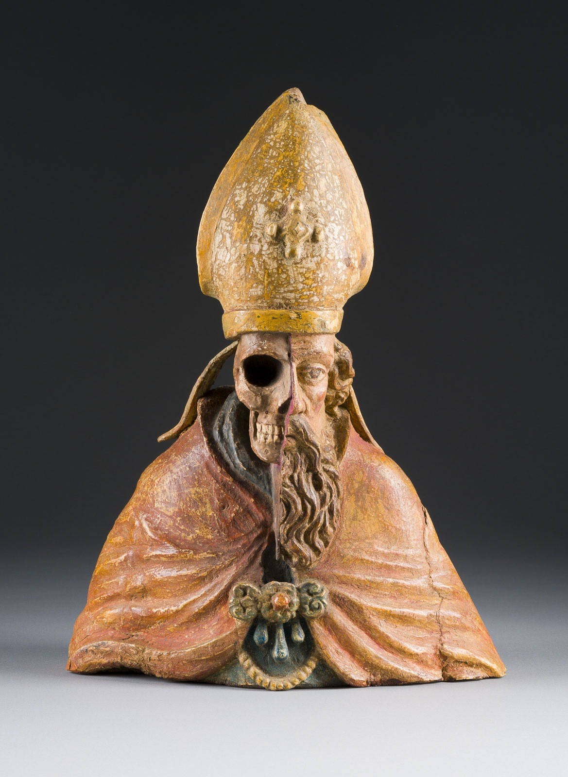 Holz, plastisch geschnitzt, polychrom gefasst. H. 44, B. 33, T. 14 cm, Gew. ca. 1,98kg. Darstellung eines halbseitig als Knochenschädel geschnitzte Männerbüste, eine Mitra und