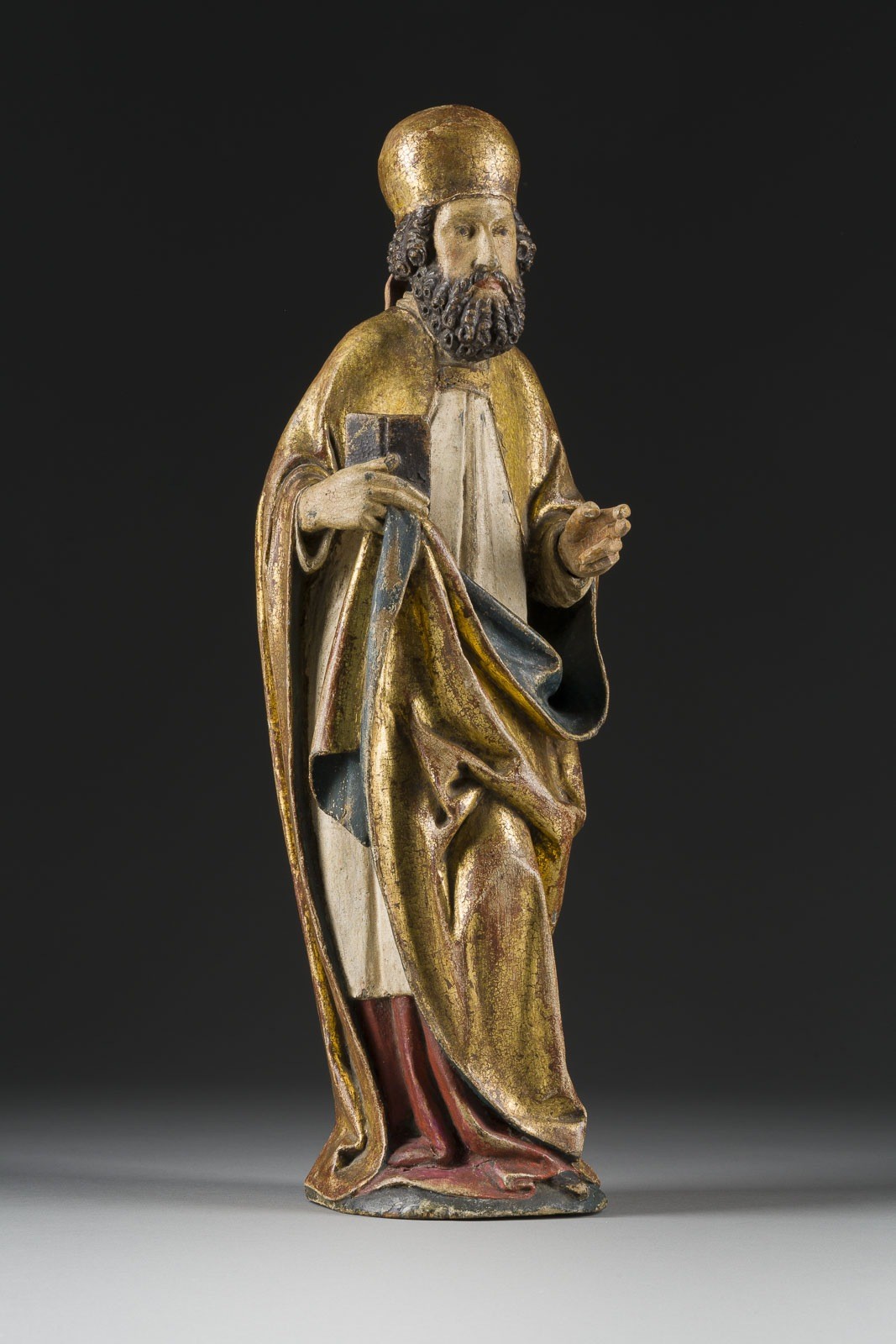 Lindenholz, plastisch geschnitzt, vergoldet, polychrom gefasst, rückseitig geflacht und gehöhlt, Leinwand Überkittelung, auf einem Sockel. H. 45, B. 16, T. 14 cm, Gew. ca. 1kg. Verso altes Sammlungsetikett. Spätgotische Heiligenfigur des Urban I., Papst und Schutzpatron der Winzer. Plastische