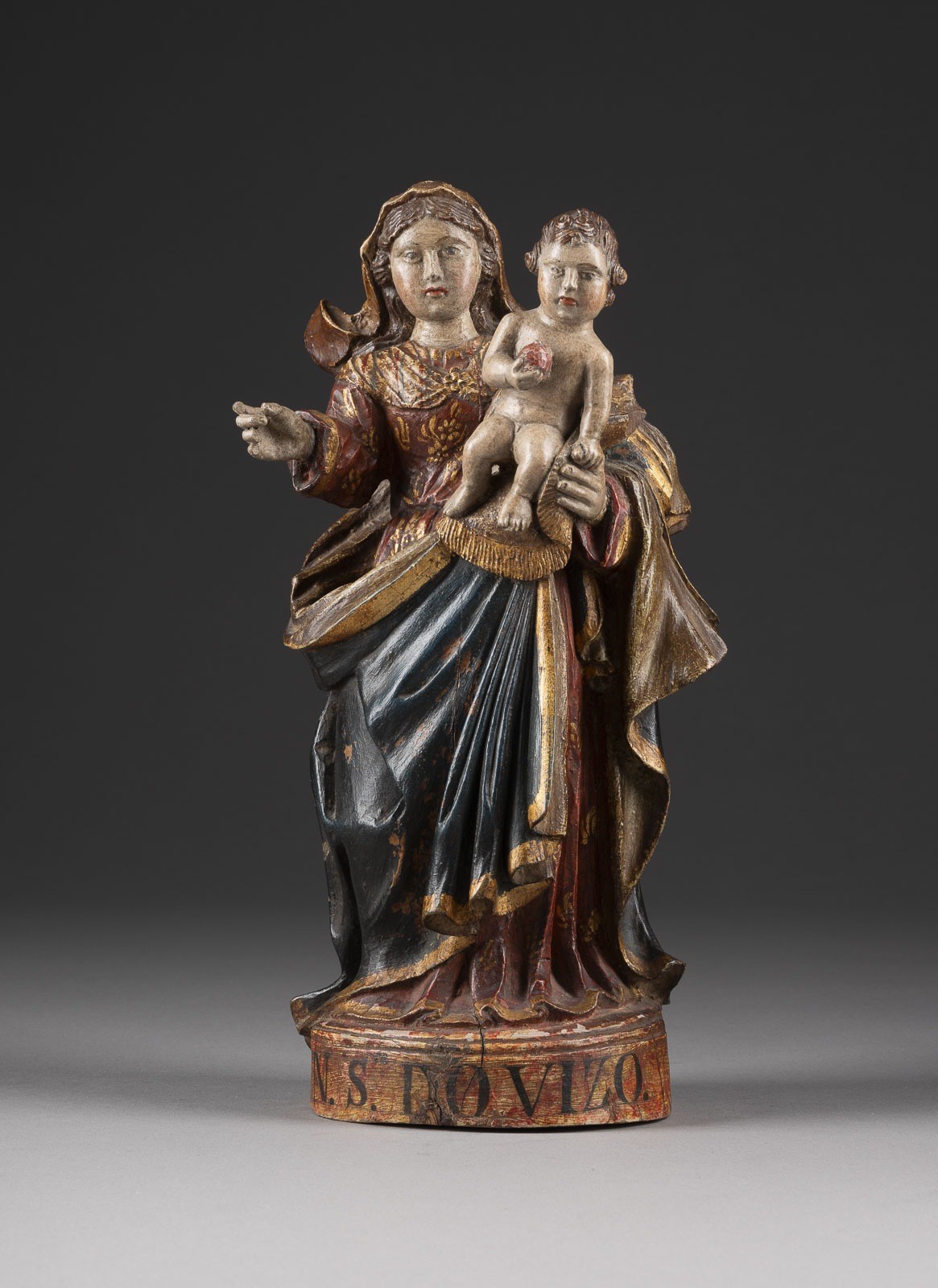 Holz, plastisch geschnitzt, vergoldet, polychrom gefasst, auf einem Sockel. H. 26, B. 12, T. 9 cm, Gew. ca. 1kg. Vorderseitig bezeichnet 'N.S. Dovizo' (Nostra Signora Dovizo), Unterseite Aufkleber Sammlung Weikart.