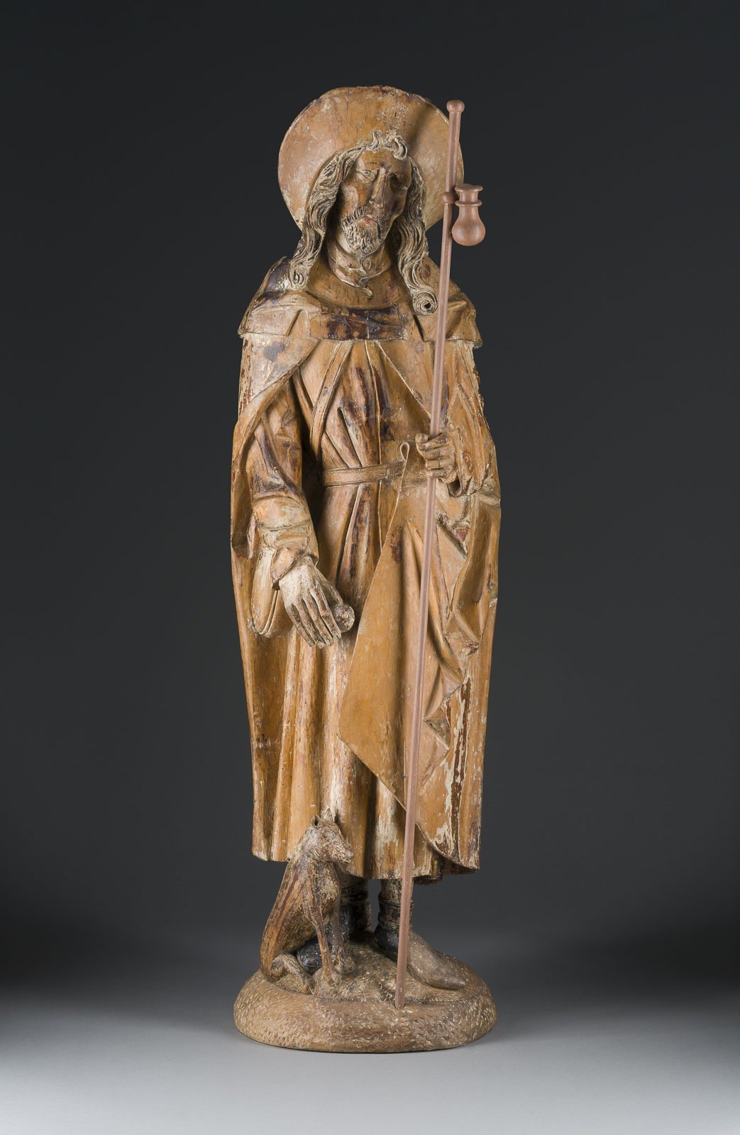 Lindenholz, plastisch geschnitzt, rückseitig geflacht und gehöhlt, auf einem Sockel. H. 120, B. 32, T. 24 cm. In der Art von Tilman Riemenschneider und seiner Werkstatt. Eindrucksvolle Darstellung des Heiligen Jakobus als Schutzpatron in typischer