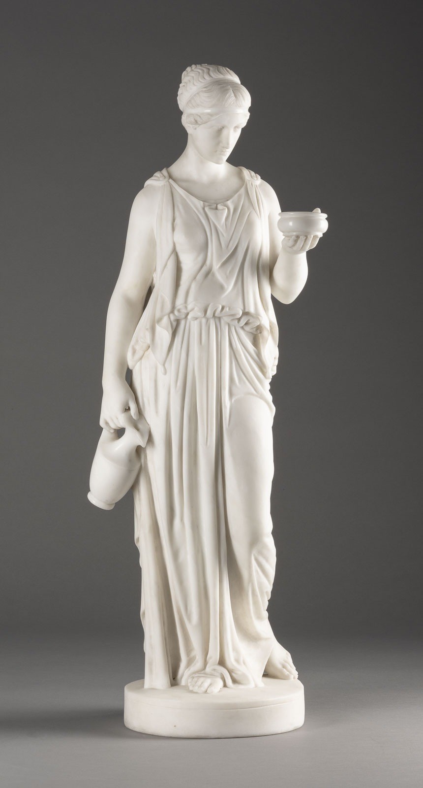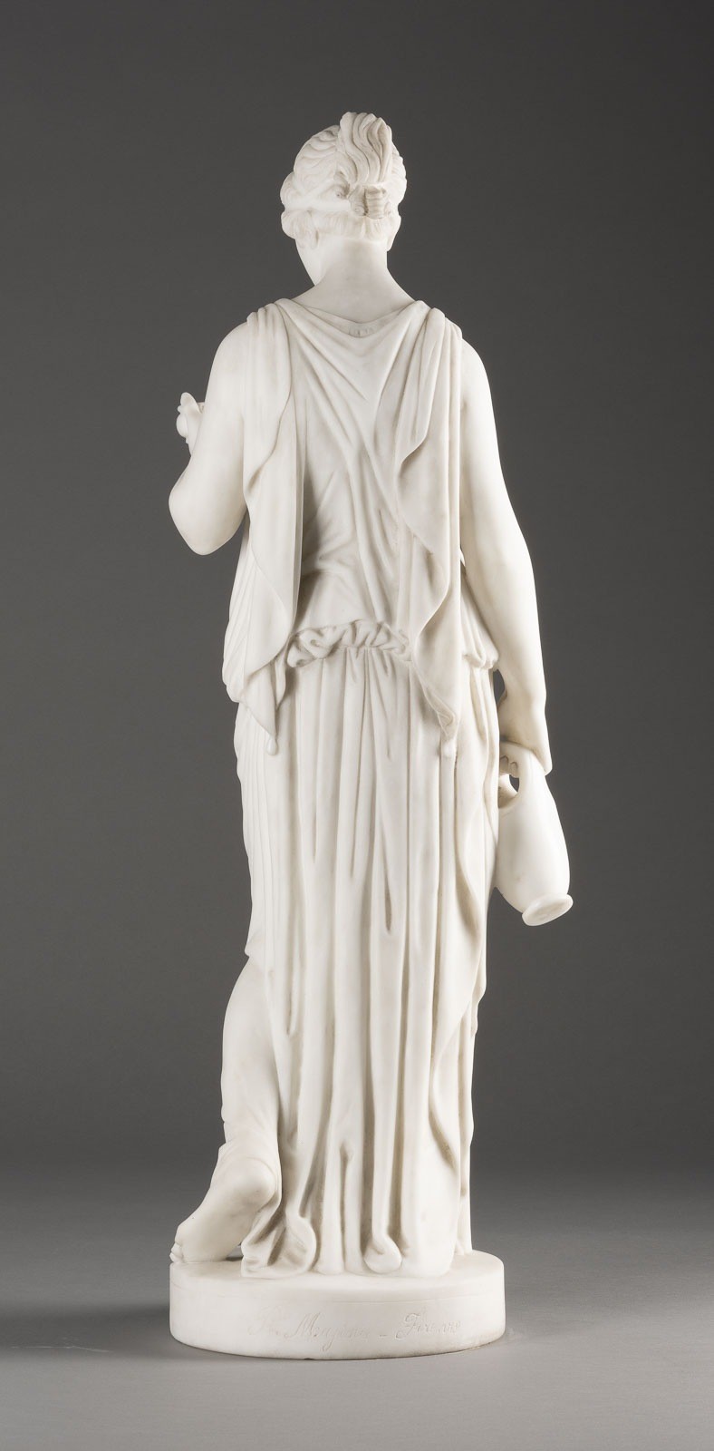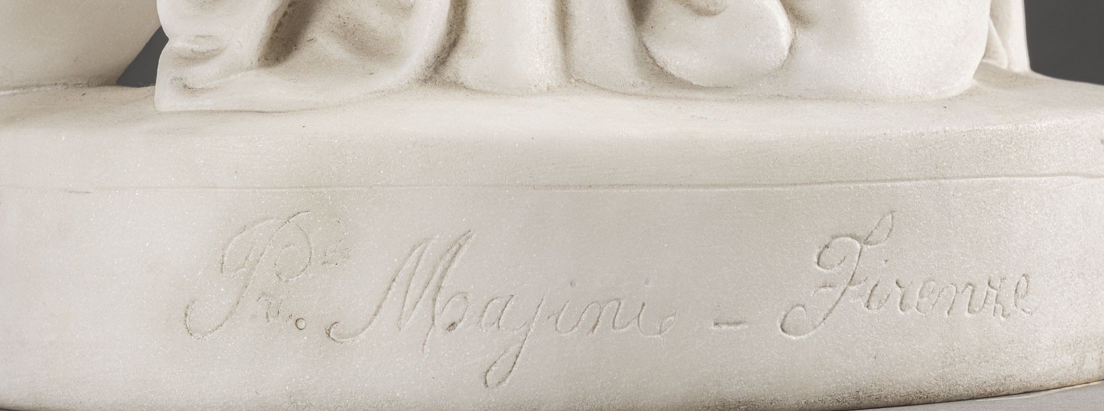 Weißer Marmor, auf runder Plinthe (H. 5 cm). Ges.-H. 80, B. 25, T. 20 cm, Gew. ca. 29 kg. Verso bez. 'Moajini Firenze'. Min. best..