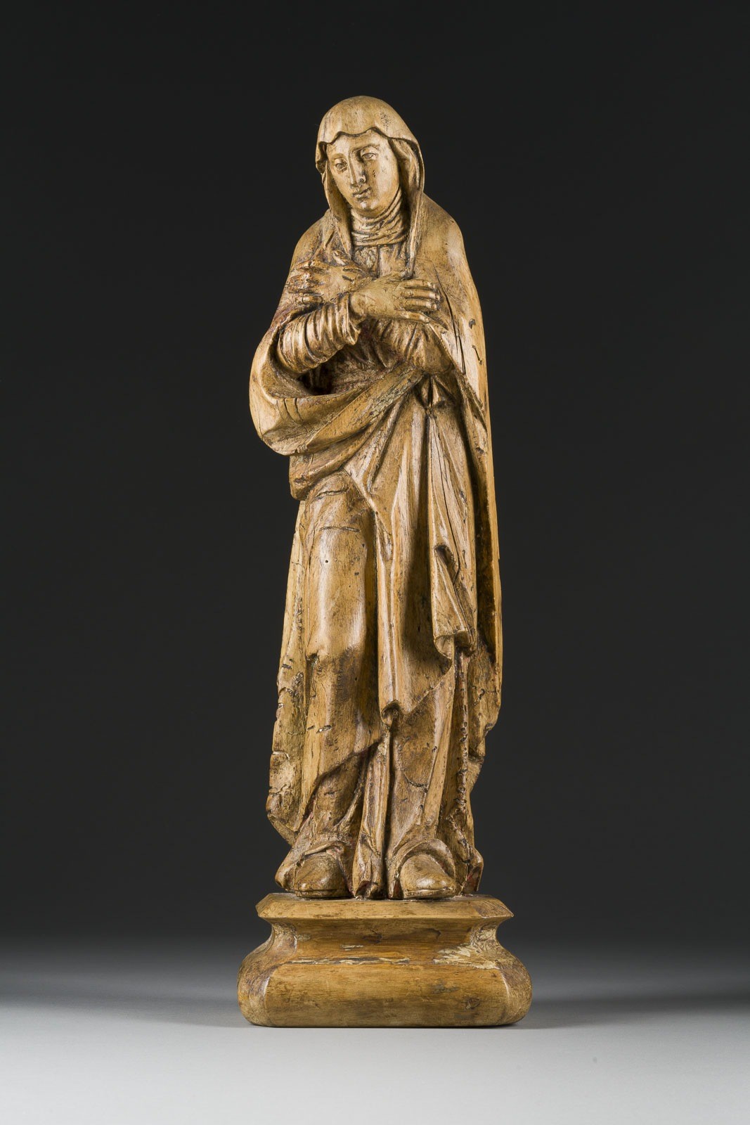 Lindenholz, plastisch geschnitzt, gebeizt, rückseitig geflacht, auf einem Sockel. H. 49, B. 15, T. 10 cm, Gew. ca. 1,45kg. Rückseitig bezeichnet 'DHZ' und 'DKZ1'. Part. best., rückseitig min. Spannungsrisse und Anobienbefall.