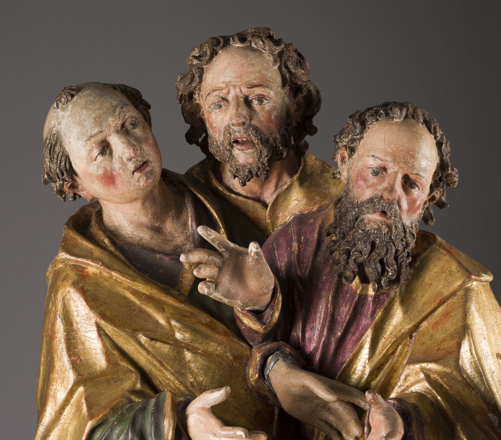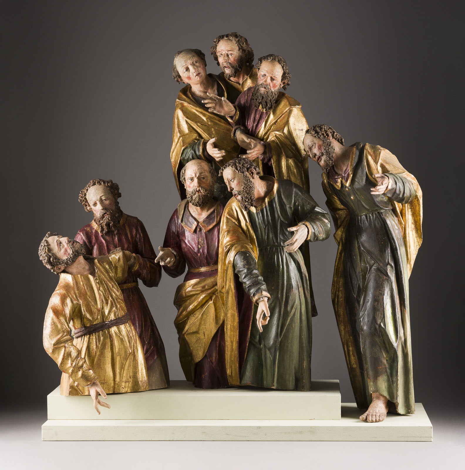 Lindenholz, plastisch, geschnitzt, vergoldet, polychrom gefasst. H. 55/92/73, B. ca. 100, T. 28/30 cm. Zugeschrieben an Hans Zürn d. J.. Hochqualitative Apostelgruppe aus der oberschwäbischen Frühbarockzeit, bestehend aus
