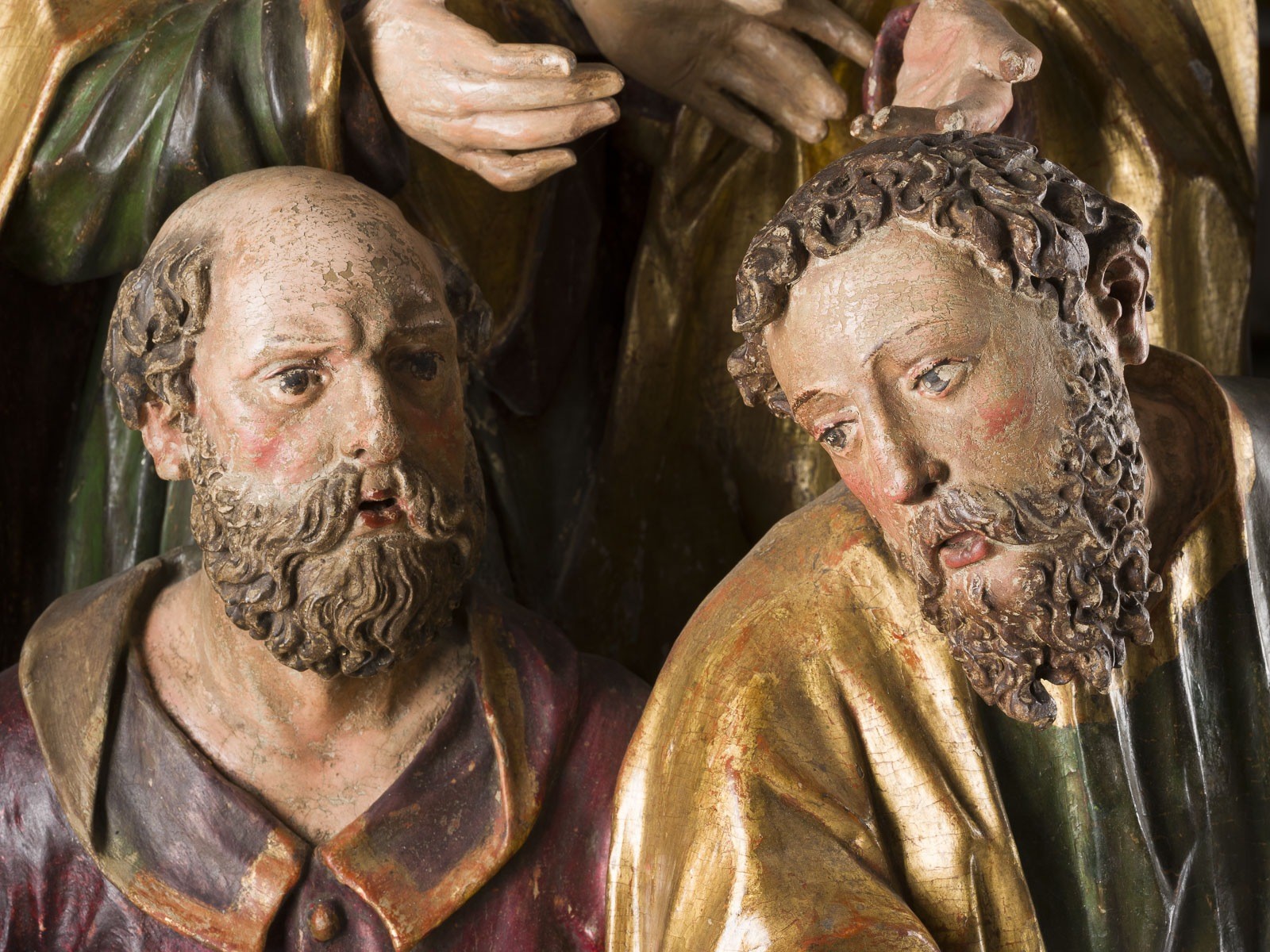 vollrund geschnitzten Halb- und Dreiviertelfiguren mit lebhaft bewegten Gewandpartien und