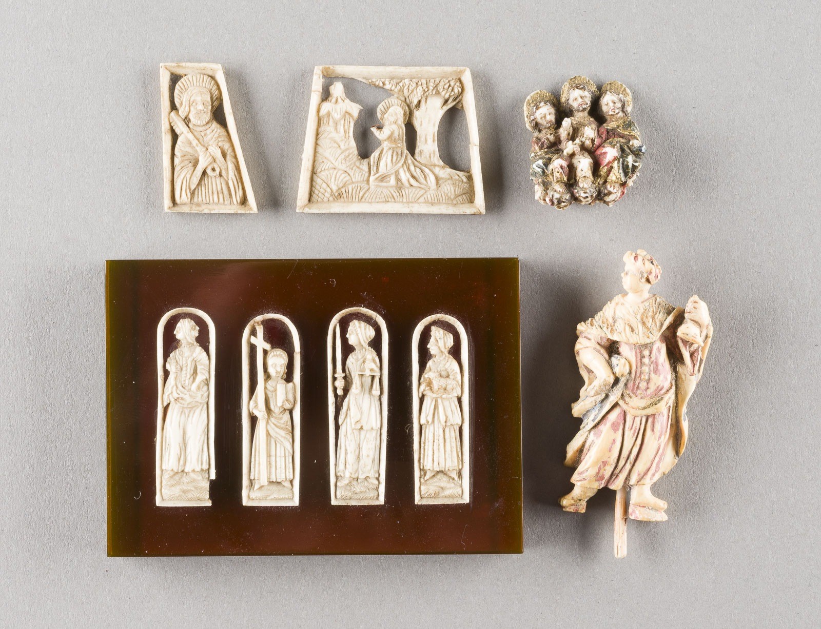 Knochen geschnitzt, teilweise reliefiert. H. von 2,5 bis 6 cm. Petrus mit Schlüssel, Heilige Barbara, Der Traum des heiligen Josef, Drei Heiligen Ahnen,