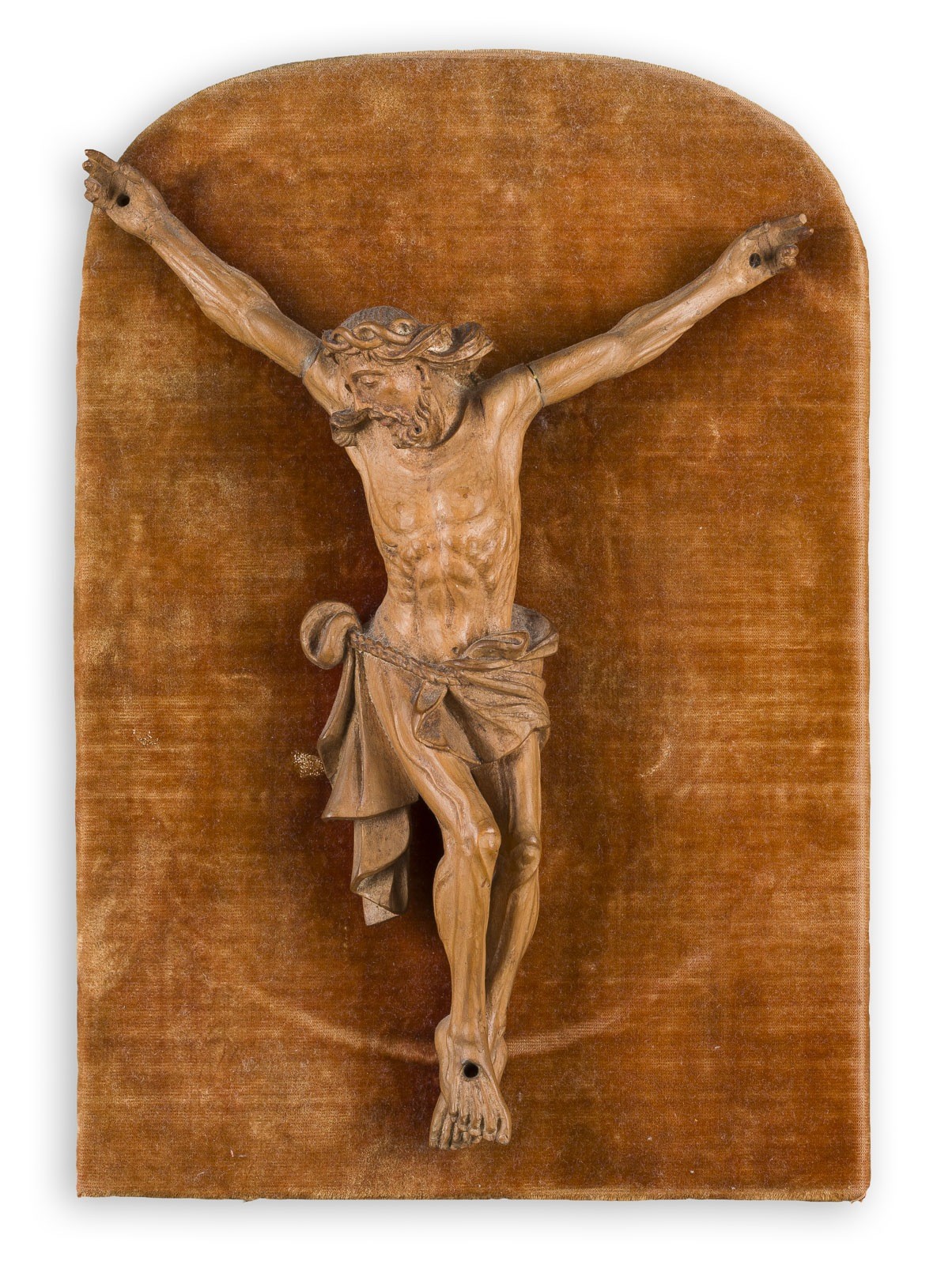 Buchsbaum, plastisch geschnitzt, auf Samtplatte (23 x 15 cm). H. 20,5, B. 15, T. 4,5 cm. Part. best.