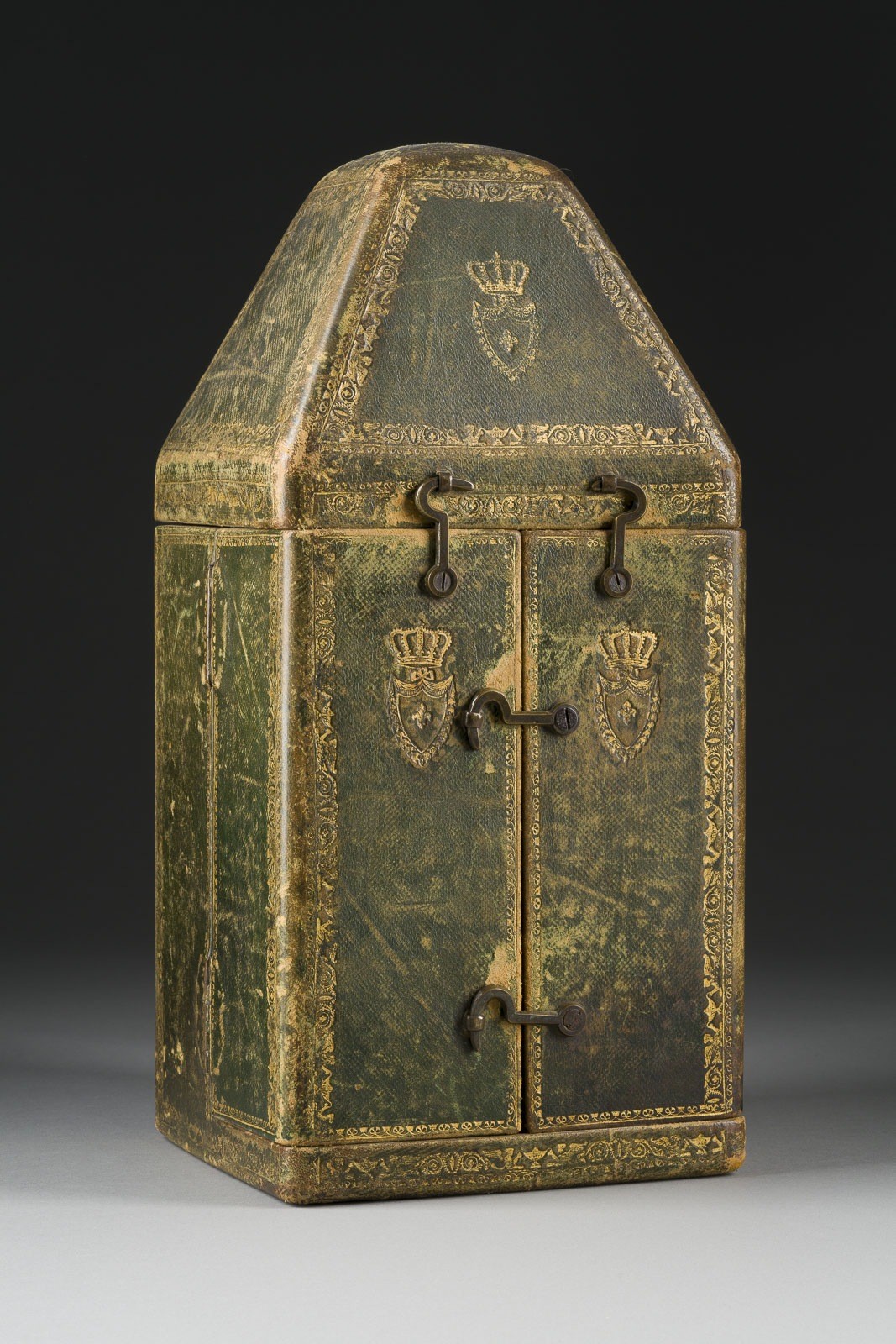 Elfenbein plastisch geschnitzt, vergoldet, Reste einer Fassung, im belederten Altarschrein, aufklappbar (38x19x16 cm). Figur H. 24, B. 7, T. 6 cm, Gew. ca. 560g. Part. best.