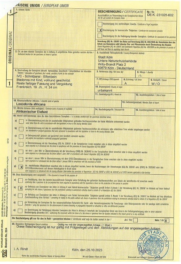 CITES-Bescheinigung liegt vor. Der Handel mit Elfenbein/Schildpatt ist nur in der EU erlaubt. Export in Länder wie USA, Kanada, England aktuell nicht möglich. Prüfen Sie die Einfuhrbestimmungen.
