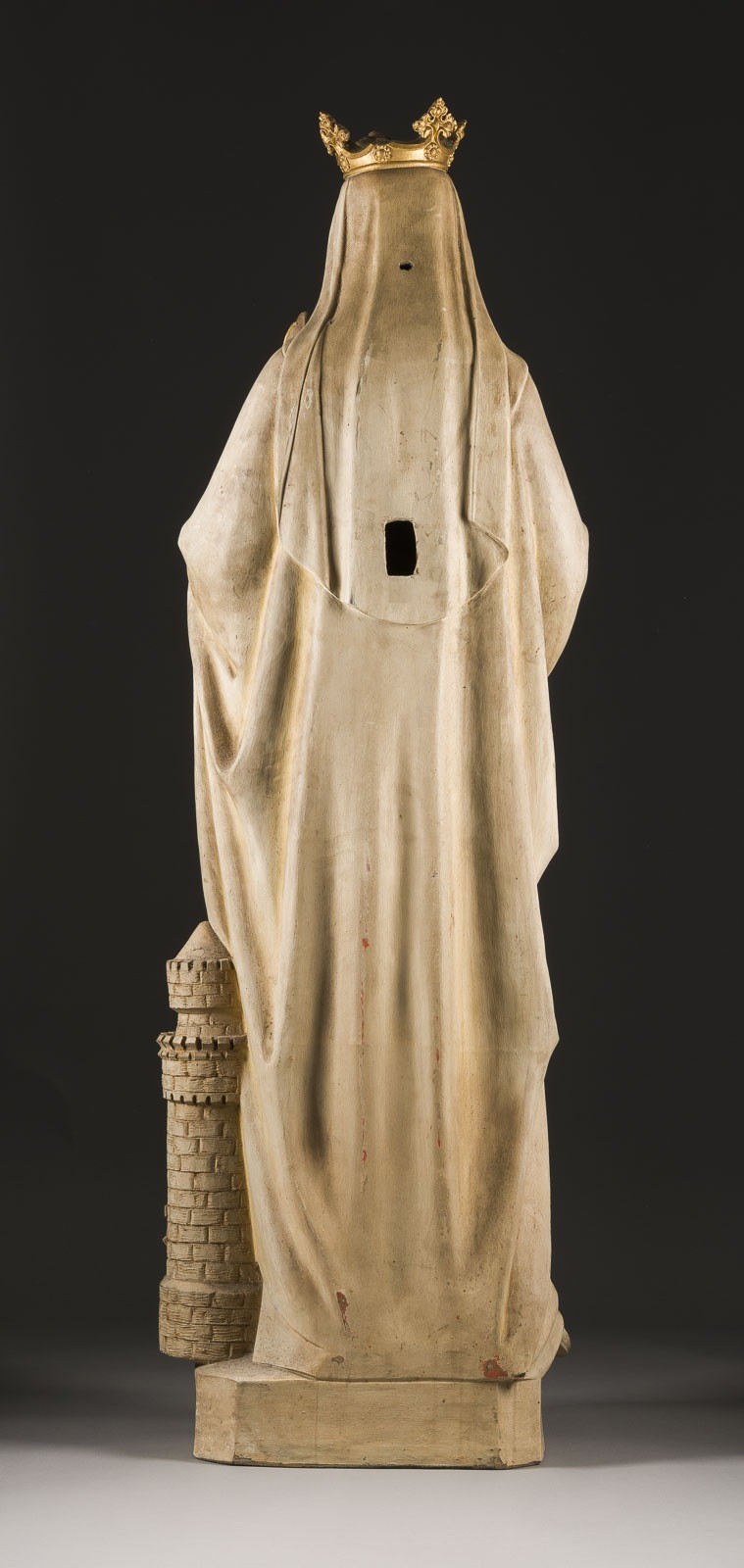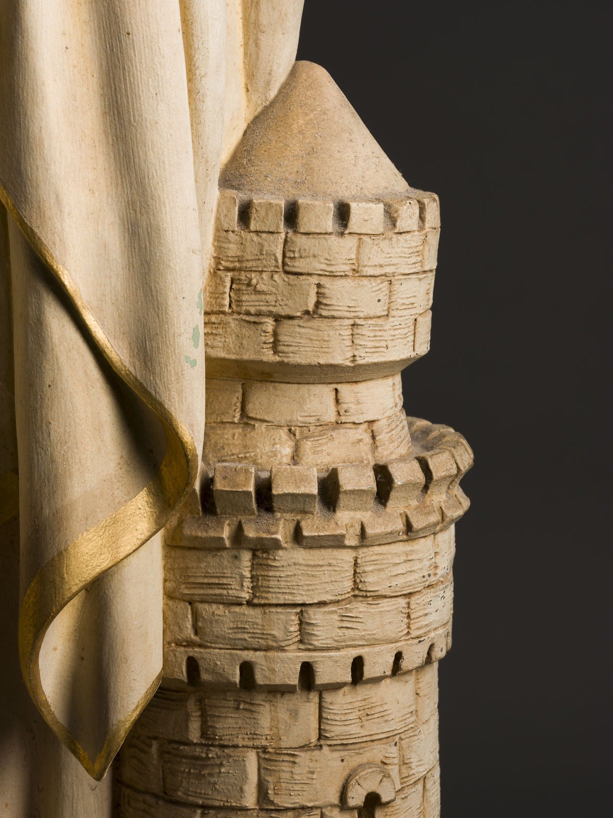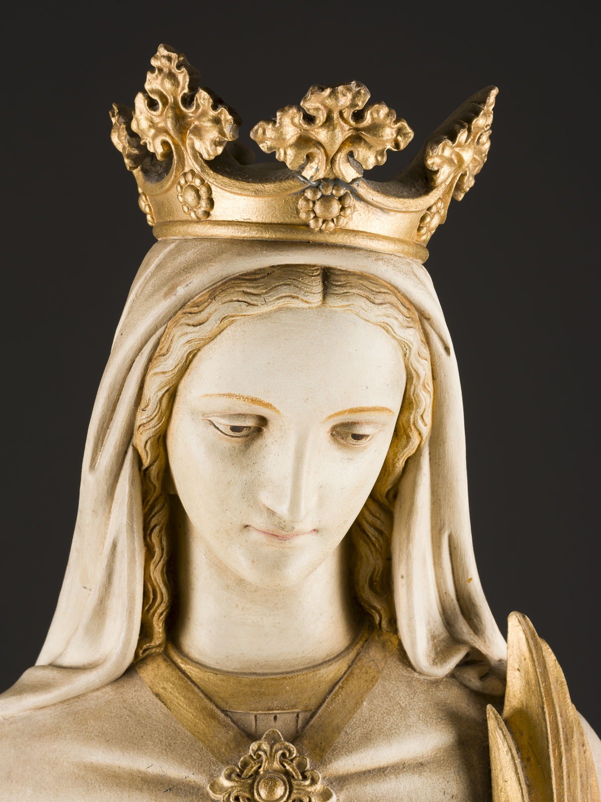 Terrakotta, vollplastisch gearbeitet, vergoldet, polychrom gefasst. H. 156, B. 48, T. 31 cm. Part. best., Krone part. besch.
