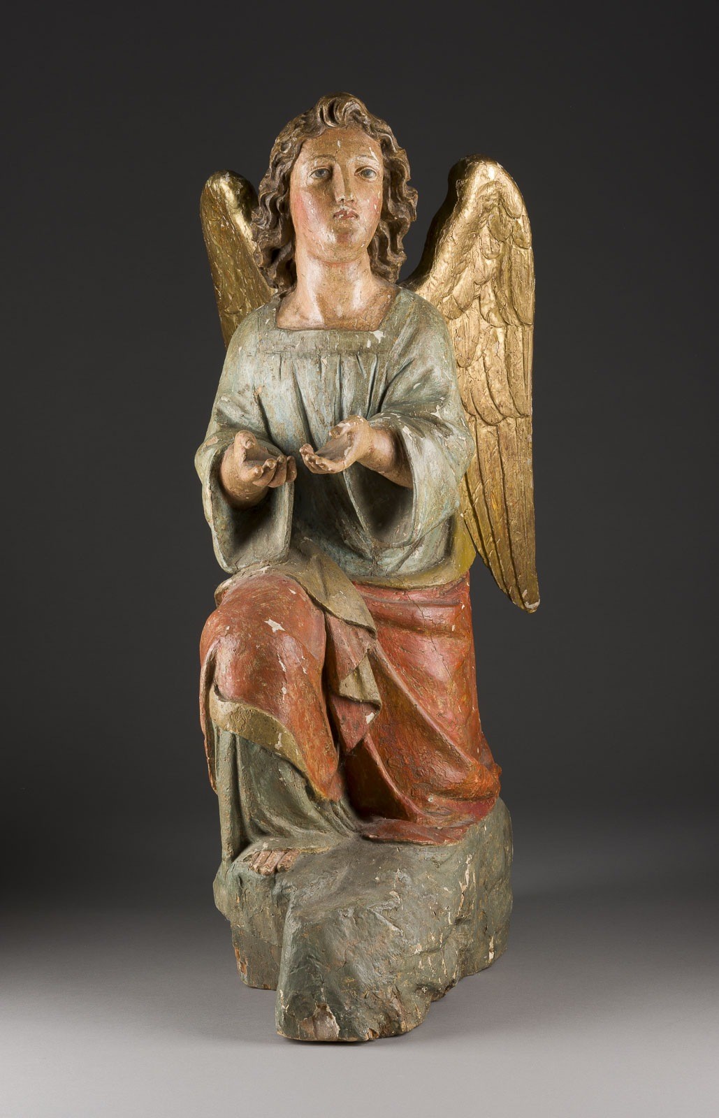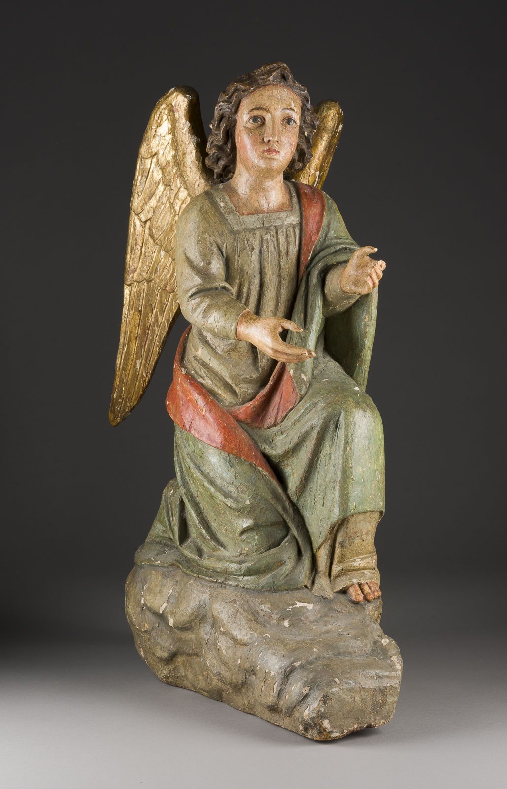 Holz, Gips, plastisch geschnitzt, vergoldet, polychrom gefasst, auf einem Wolkensockel. H. 77/67, B. 30/32, T. 63/54 cm. Part. best., besch, Fassungsverluste, rest.
