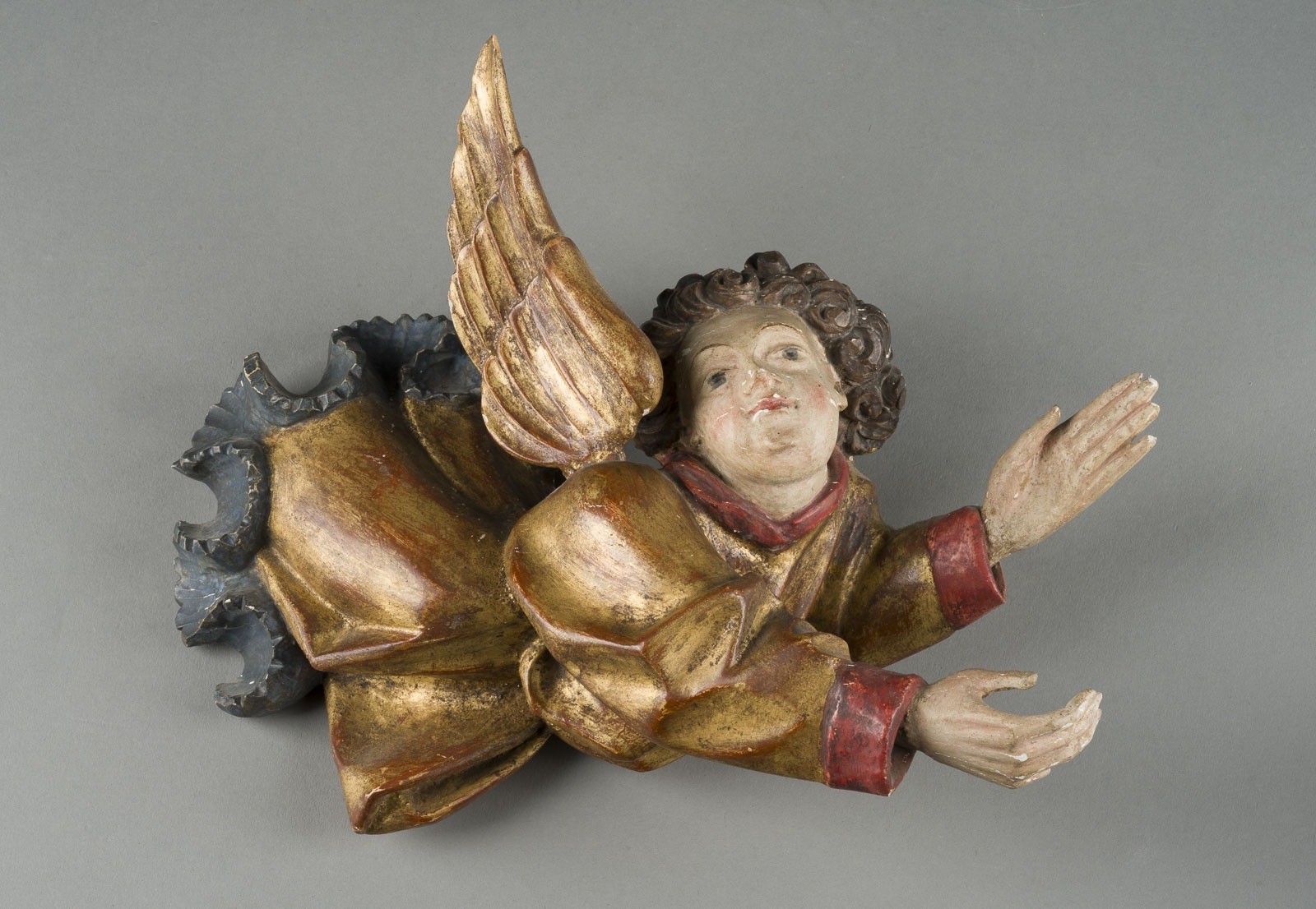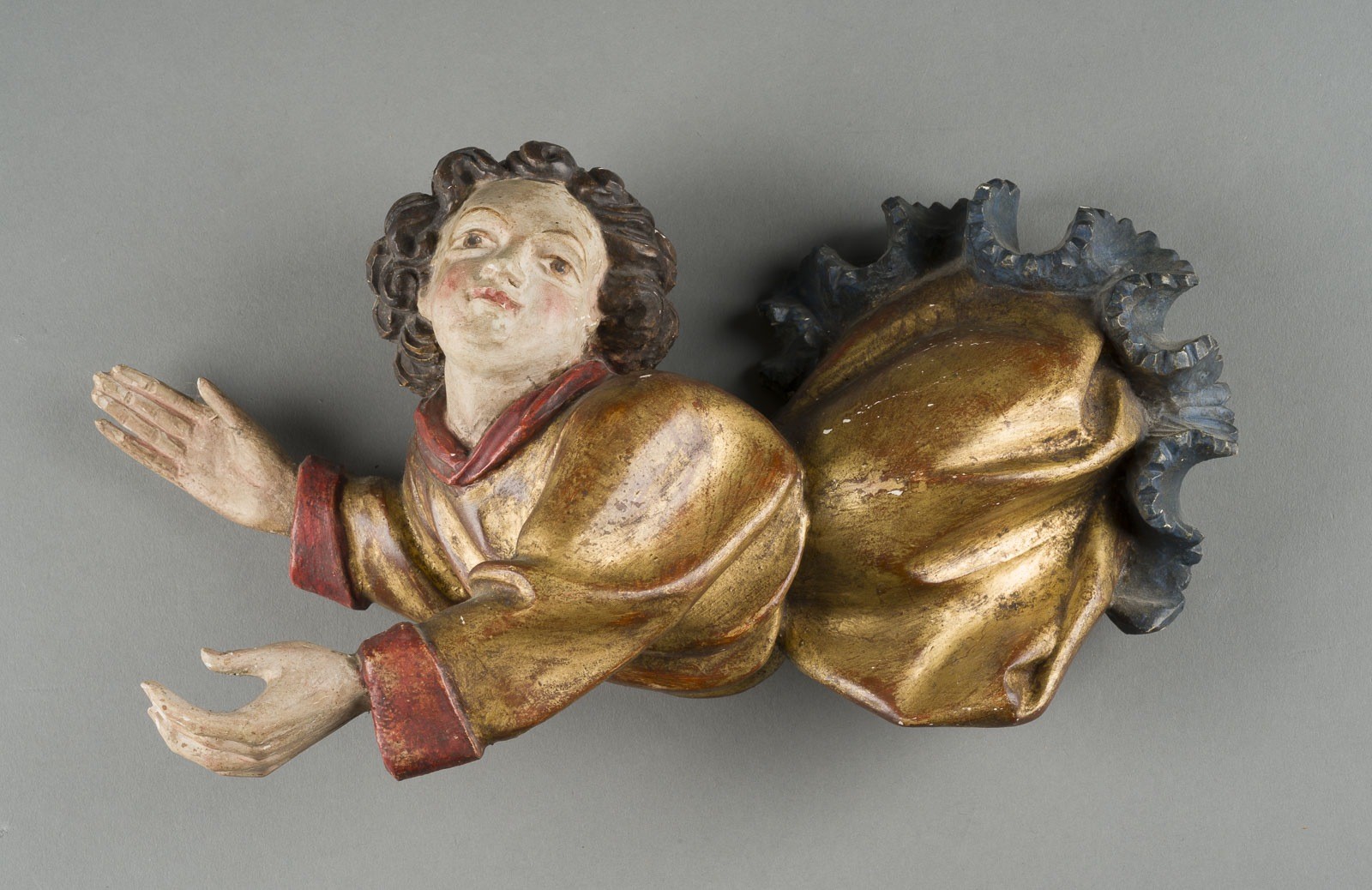 Holz, plastisch geschnitzt, polychrom gefasst und vergoldet, rückseitig geflacht. H. je 18, B. 29, T. 10 cm, Gew. ca. 0,5/0,42kg. Part. Fassungsverluste und best.