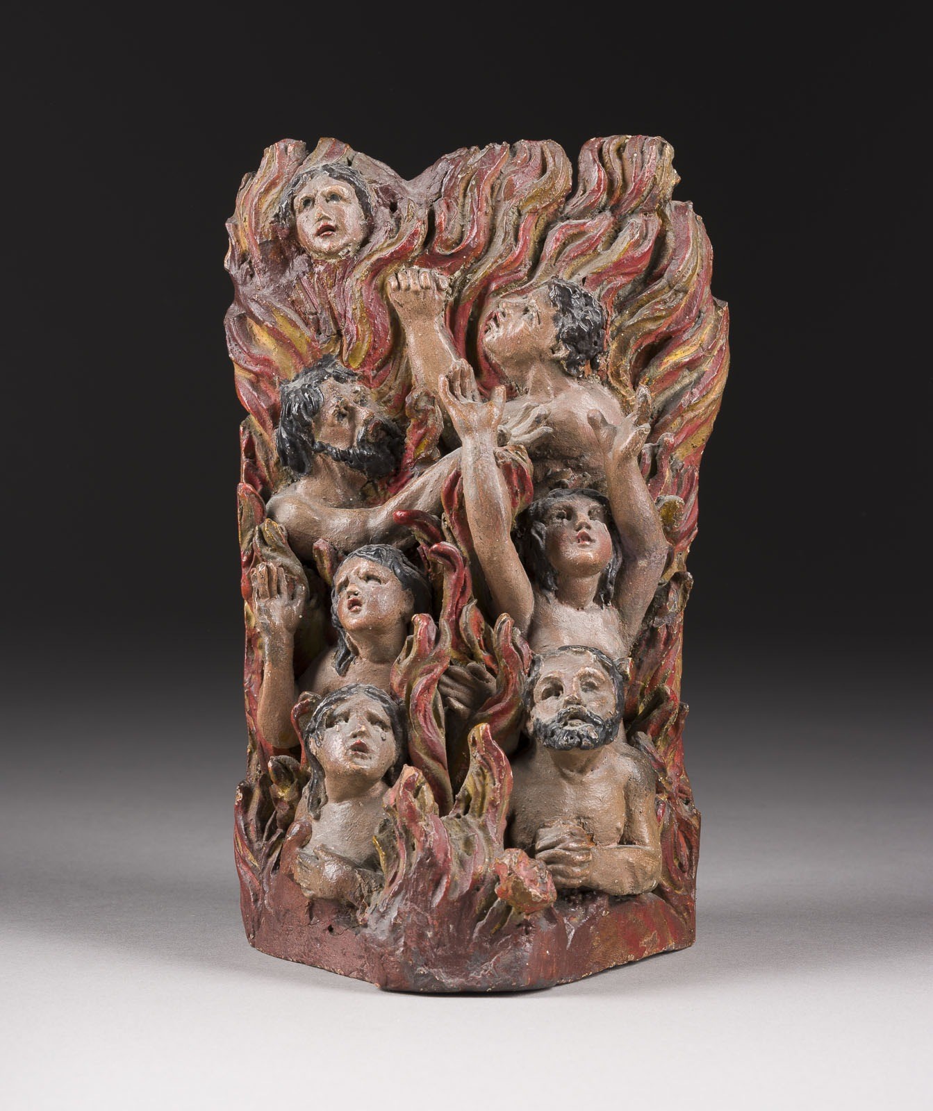 Terrakotta, plastisch modelliert, originale polychrome Fassung. H. 18,5, B. 11,5, T. ,9,5 cm, Gew. ca. 0,76kg. Ausdrucksstarke Terrakottafigur mit der Darstellung der Armen Seelen im Fegefeuer. Die