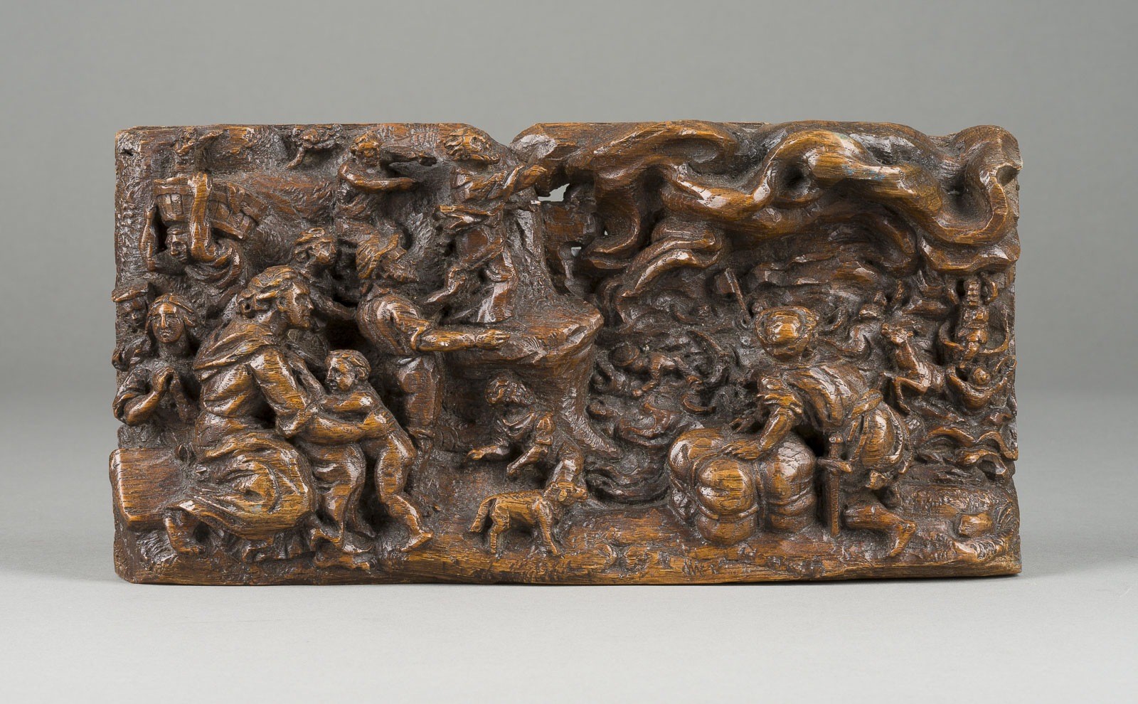 Holz, reliefiert, gebeizt. H. 16, B. 30, T. 4 cm, Gew. ca. 0,6kg. Dynamische Darstellung der biblischen Szene 'Flucht aus Ägypten'. Im linken Vordergrund