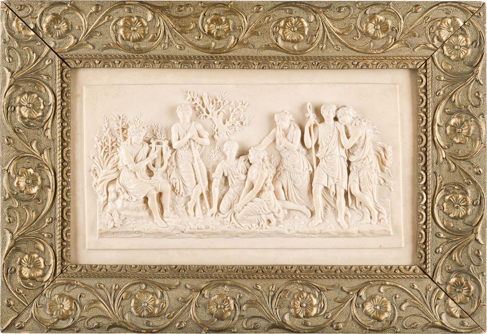 Steinguss, vergoldeter Holzrahmen (R. 29,5 x 43 cm). Relief 18 x 32 cm, Gew. ca. 2,7kg. Unten links signiert 'C. F. Becker'. Dekoratives fein gearbeitetes Hochrelief mit mythologischen Darstellungen der Venus sowie