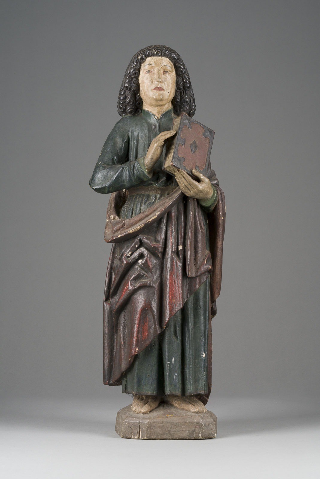 Holz, plastisch geschnitzt, polychrom gefasst, Gipsauflage, auf einem Sockel. H. 69, B. 24, T. 18 cm. Part. best., besch. und rest., Fassungsverluste.