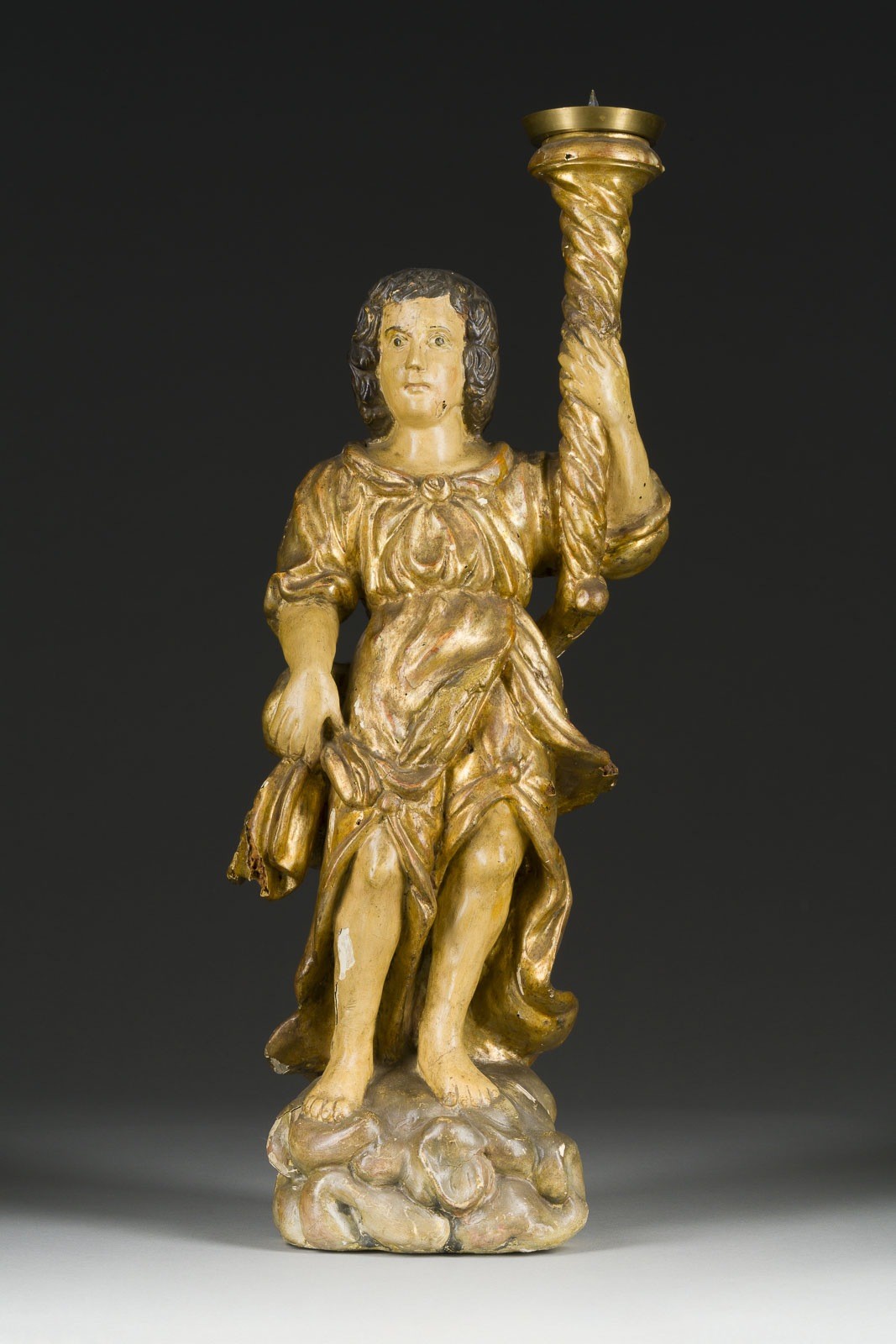 Holz, vollplastisch geschnitzt, vergoldet und polychrom gefasst, Gipsauflage. H. 72, B. 27, T. 16 cm. Part. best., besch., Fassungsverluste.