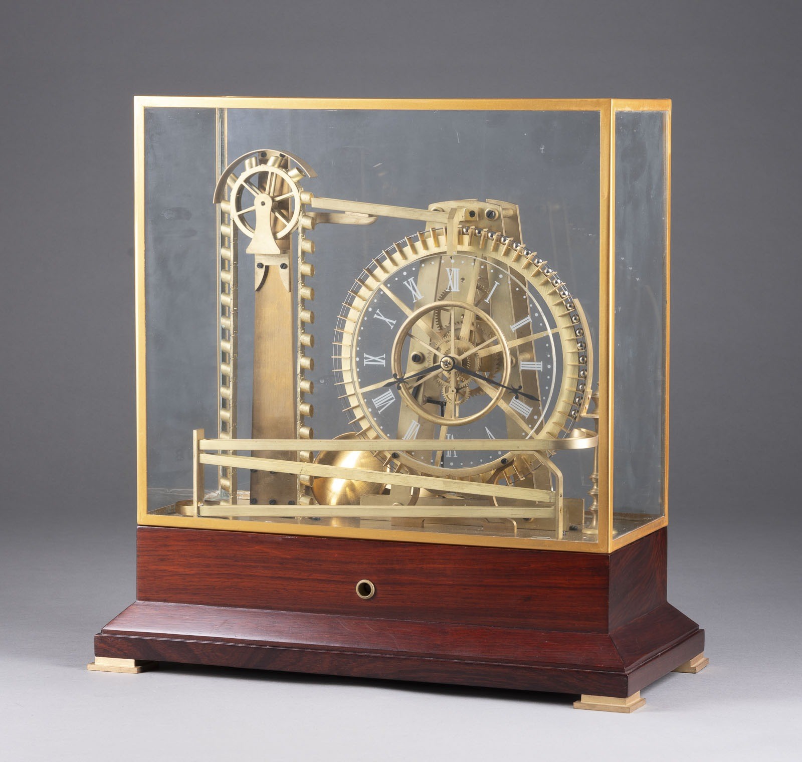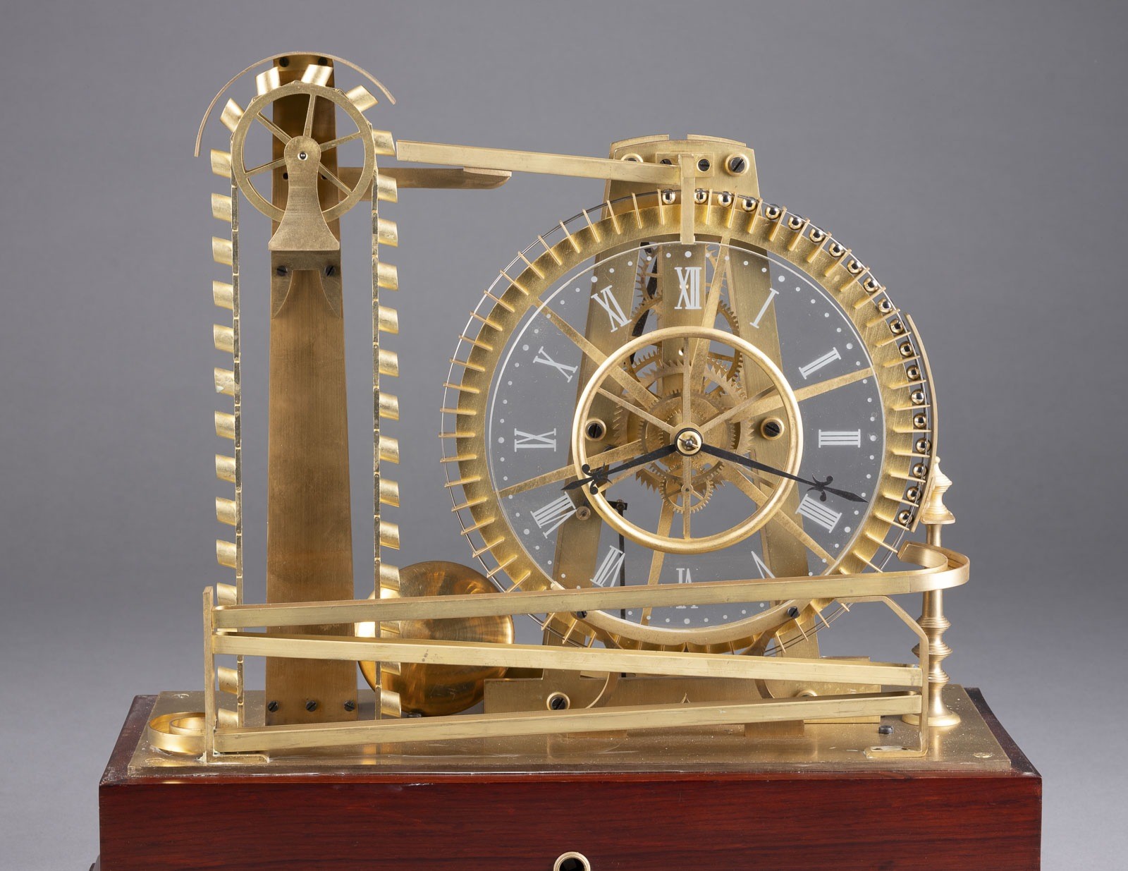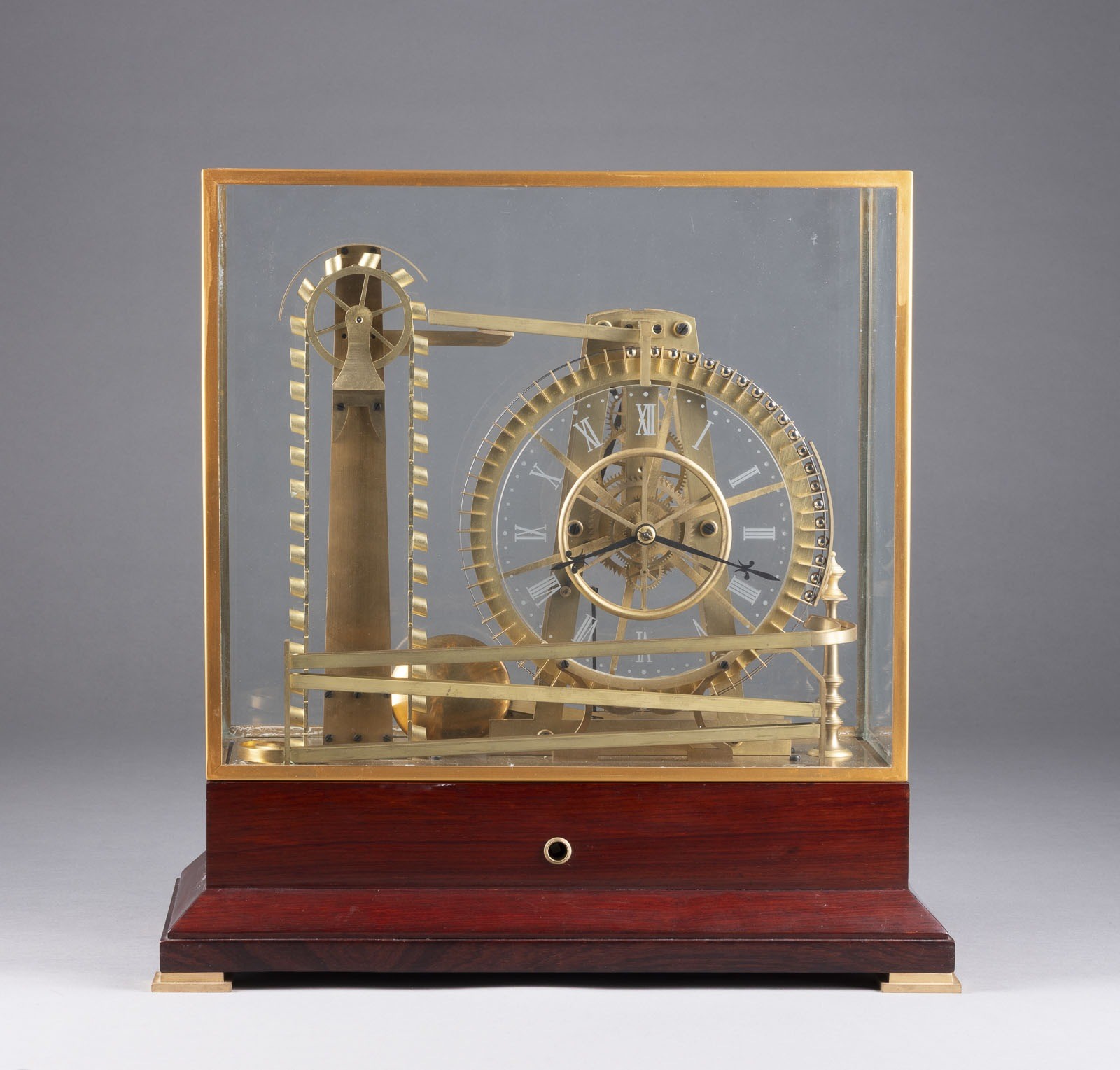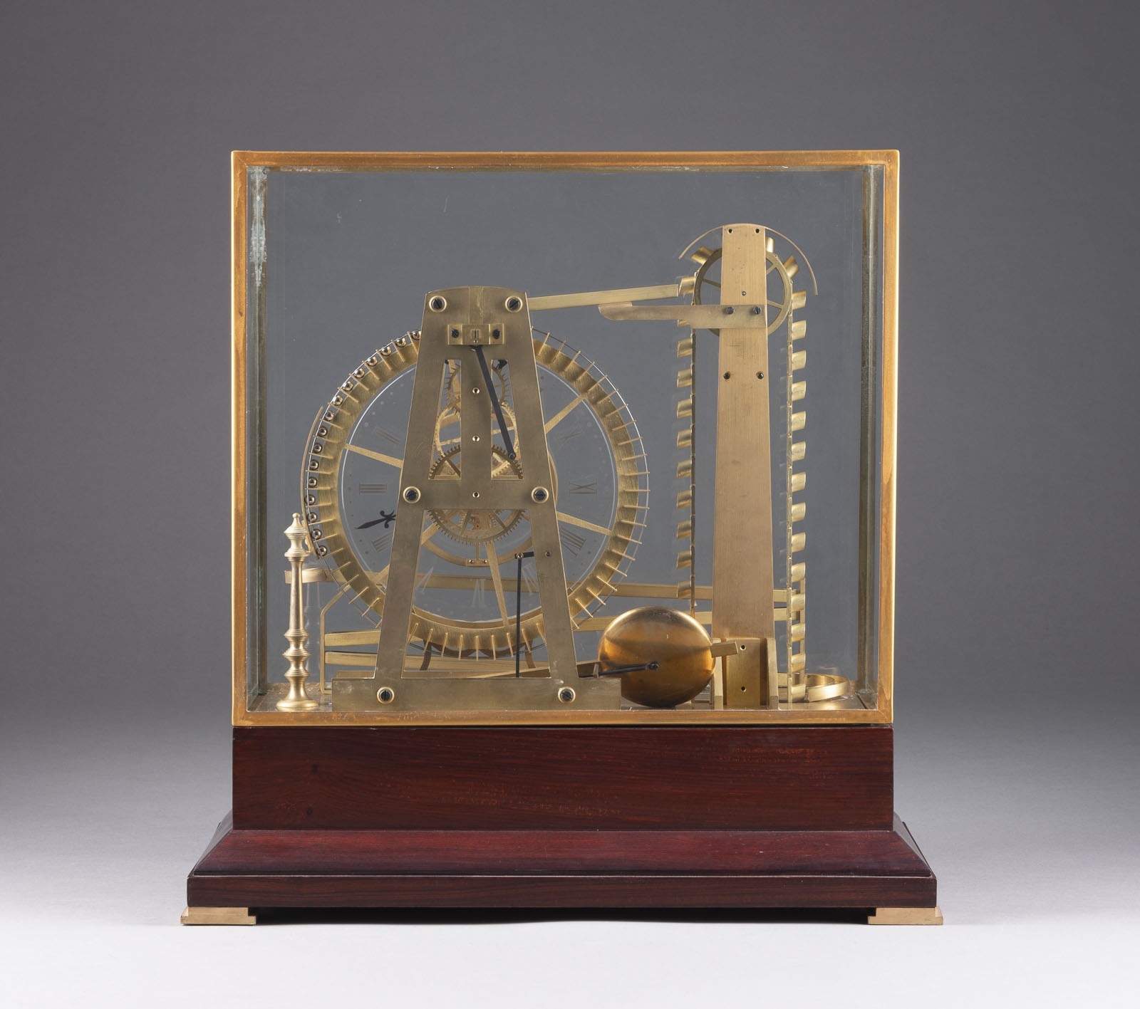 Holz, Messing, Stahl, Glas. 44,5 x 43,5 x 21,5 cm (mit Kasten), ca. 29,5 x 36. Auf Holzsockel mit Glassturz. Kugellaufbahn mit Rad und Schöpfkelle. Glaszifferblatt mit