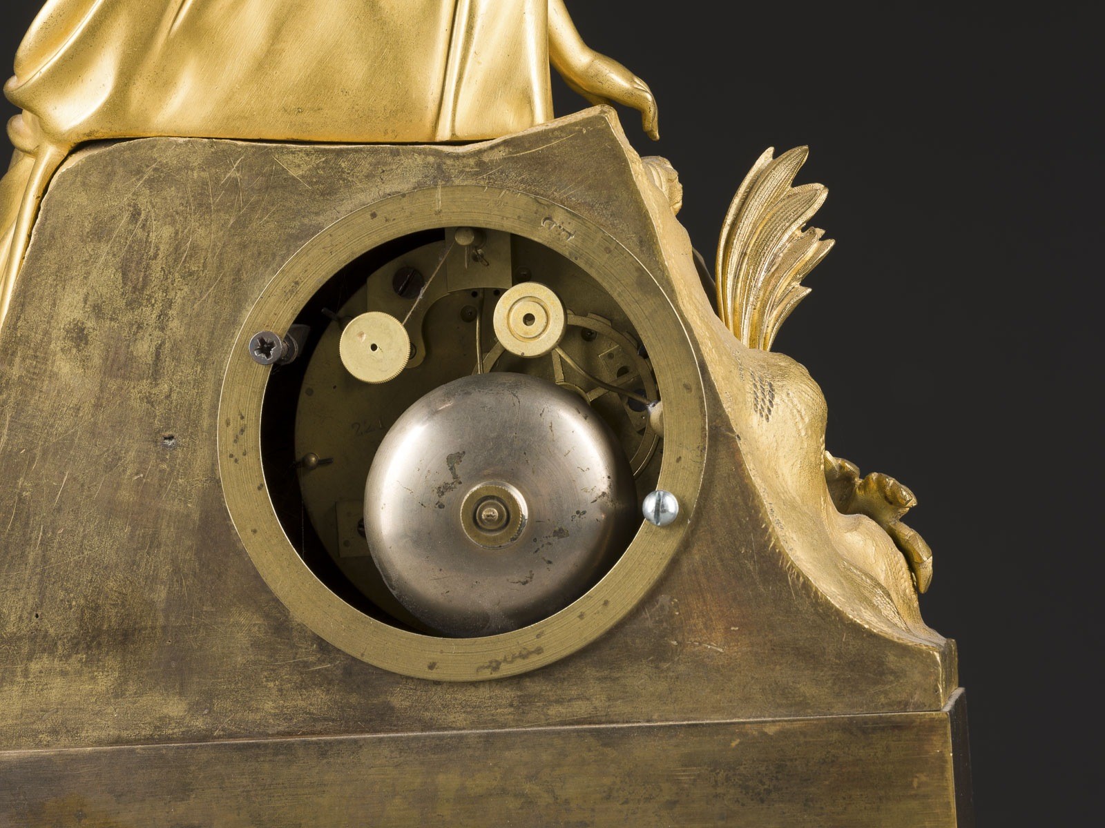 und Stahlzeigern. Part. ber., besch., angelaufen, Attribute der Figur fehlen; Funktion ungeprüft; ohne Pendel und Schlüssel.