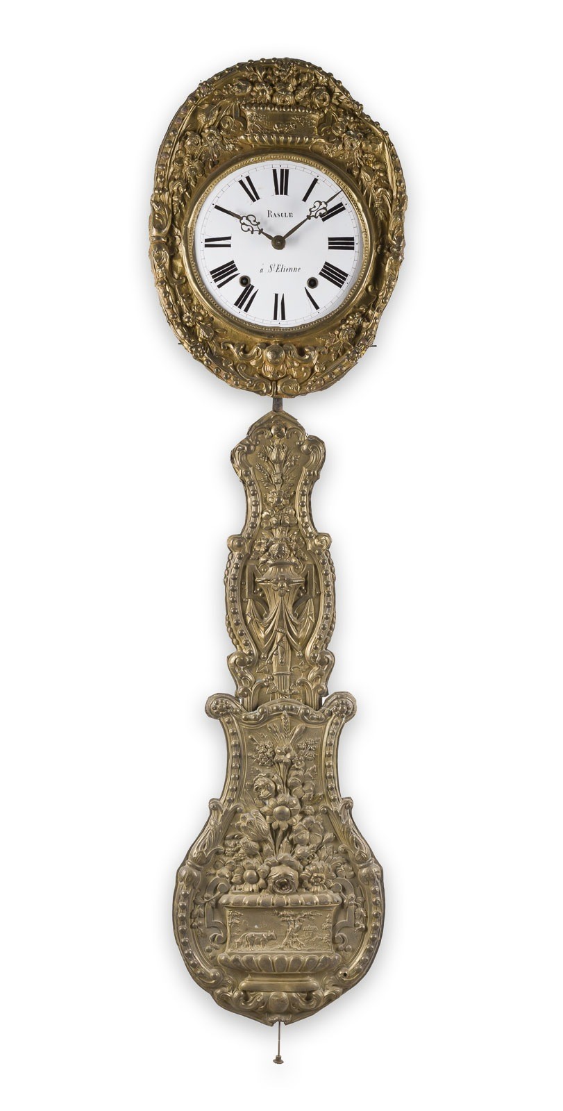Messing, getrieben, Email, Stahl, Metall. 47 x 36 x 16 cm (Uhrenkopf), Pendel Ges.-L. ca. 10. Auf dem Zifferblatt bez. 'Rascle à St. Etienne'. Floral getriebenes Messingschild. Weißes emailliertes Zifferblatt mit römischen Zahlen und