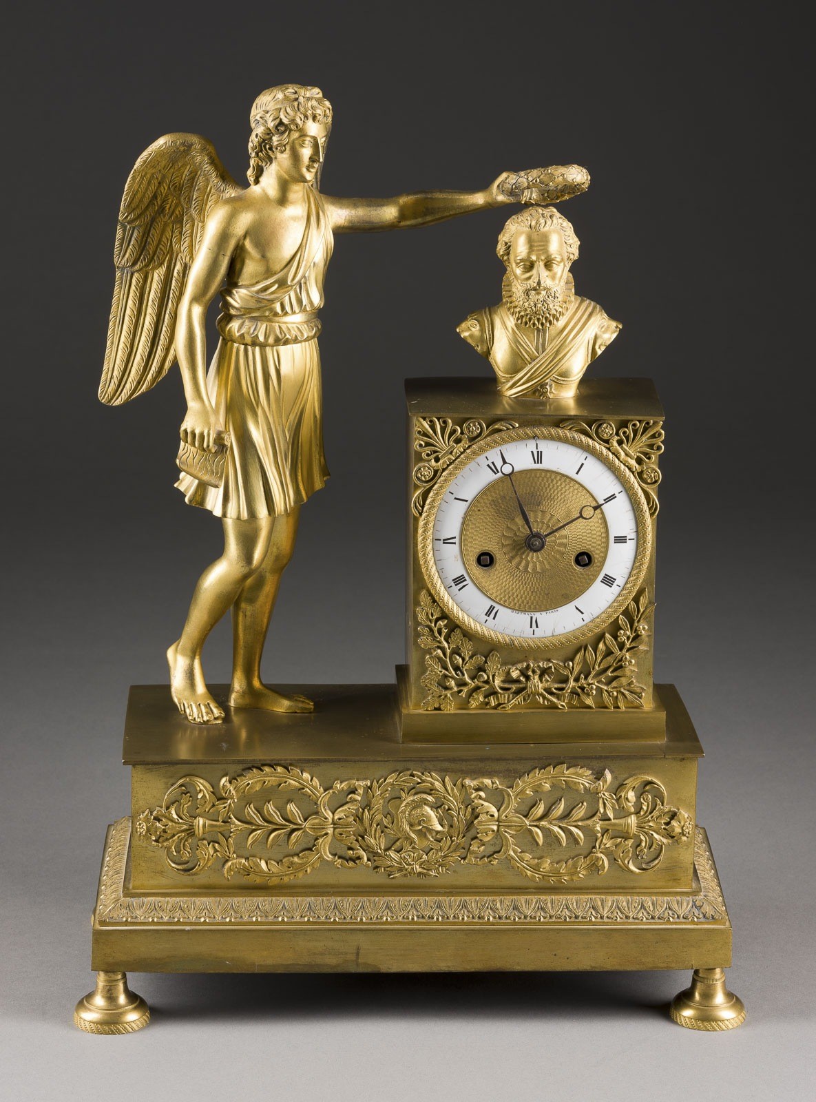 Bronze, vergoldet, Email, Metall, Stahl. 45 x 32 x 15,5 cm. Auf dem Ziffernring bez. 'Hartmann à Paris'. Auf hohen Füßen floral vezierter Rechtecksockel mit vollplastischer Figur eines antiken