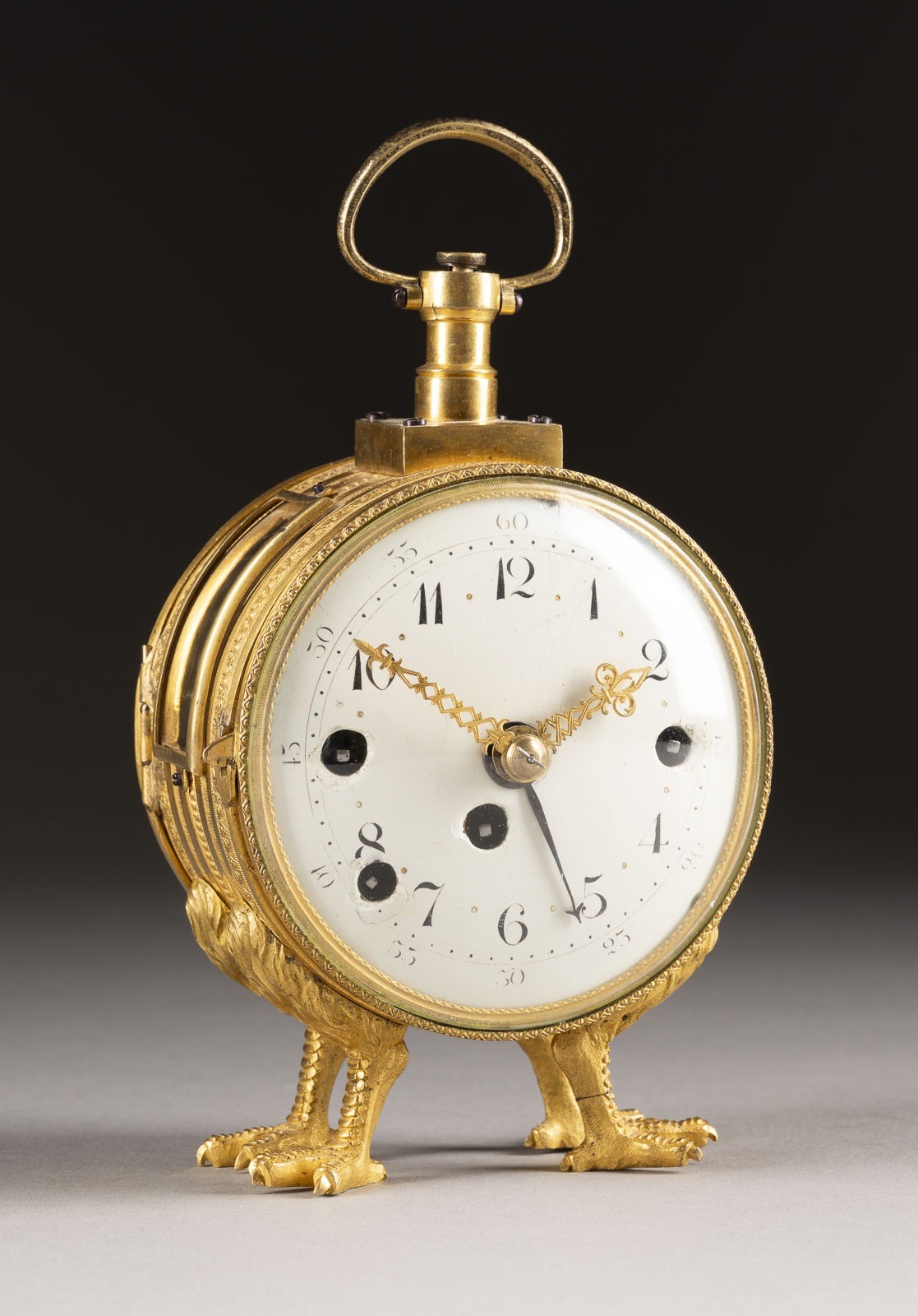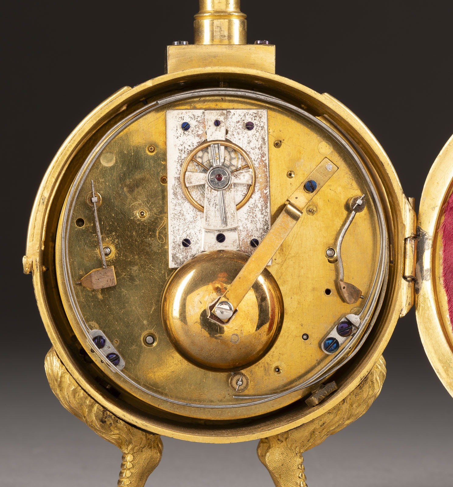 Bronze, vergoldet, Metall, Email, Glas. H. 15,5 cm, B. 10 cm. Auf vier Klauenfüßen rundes, seitlich verglastes Werk mit feinen, reliefierten