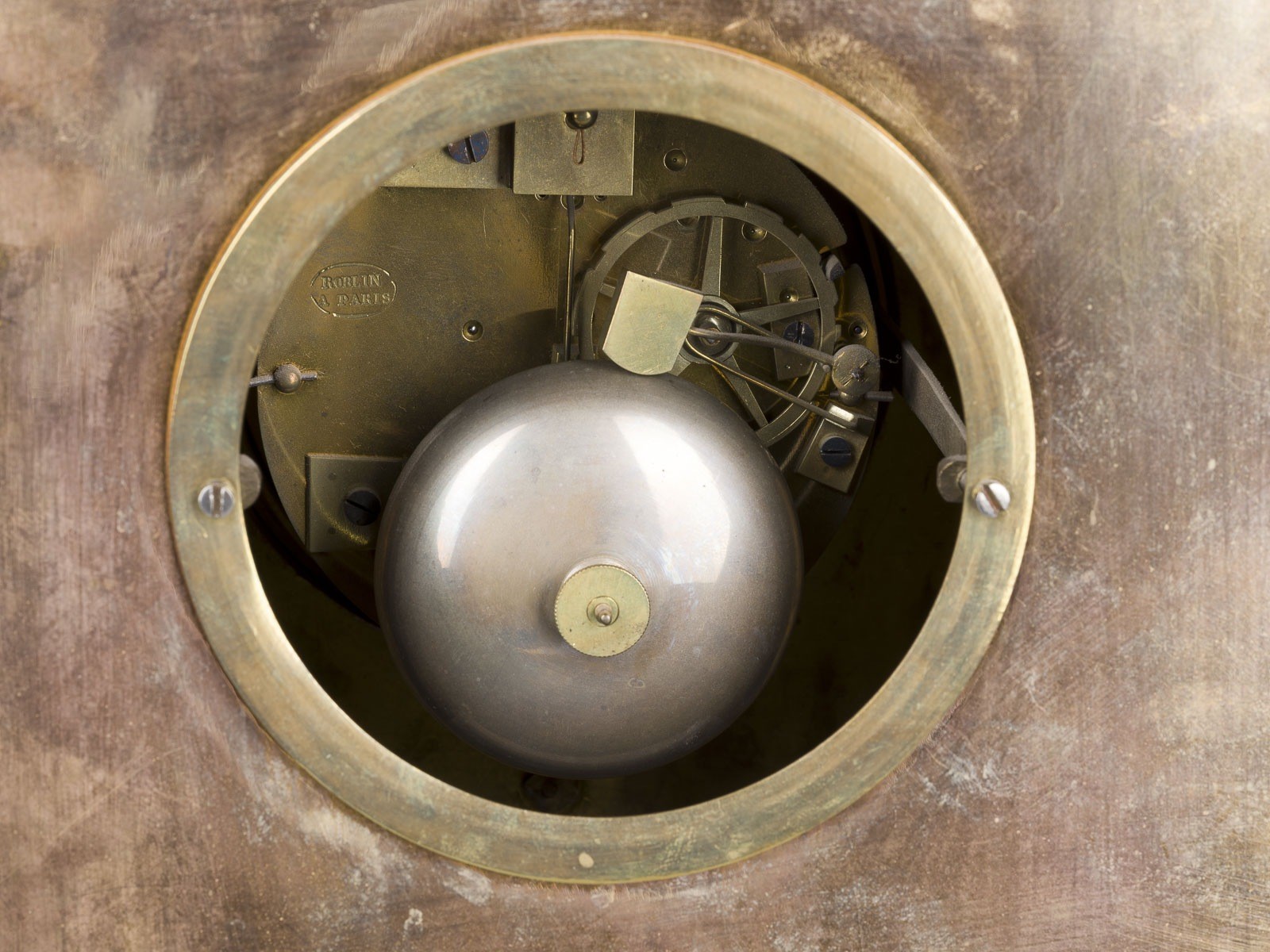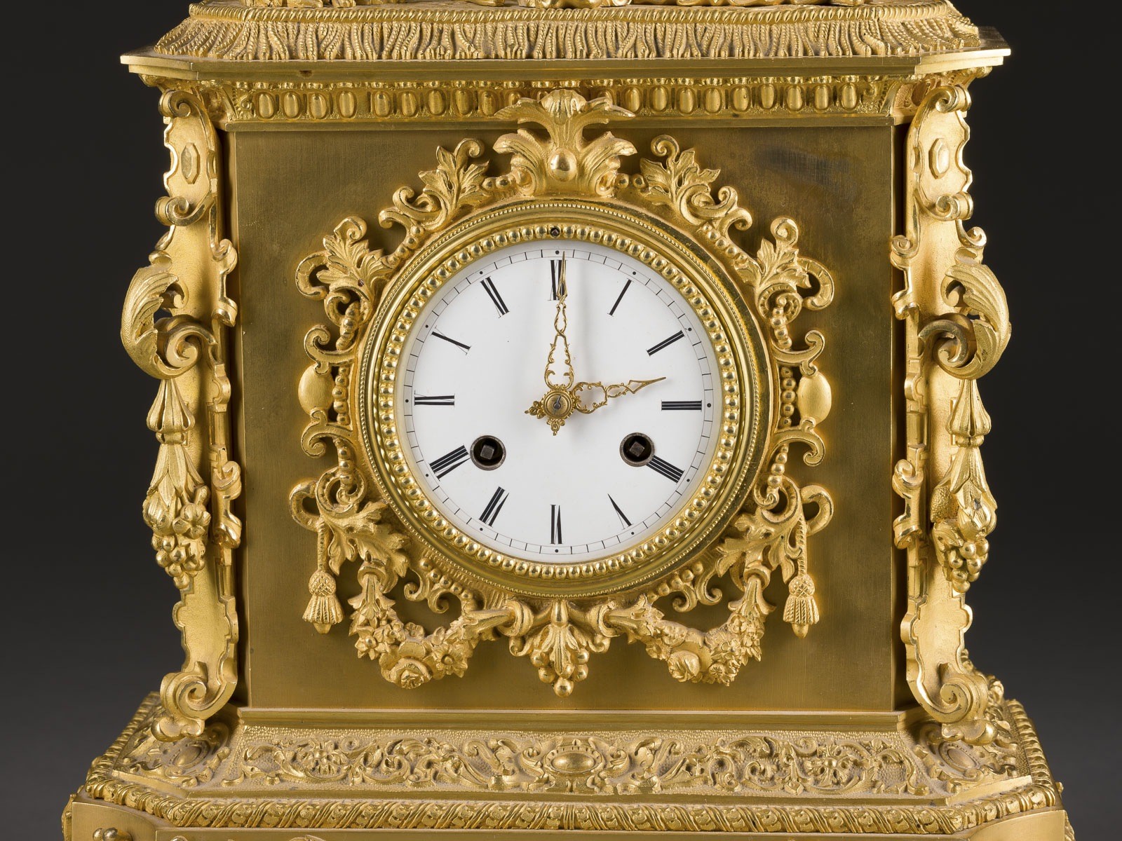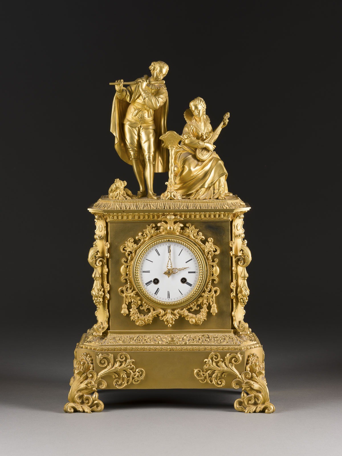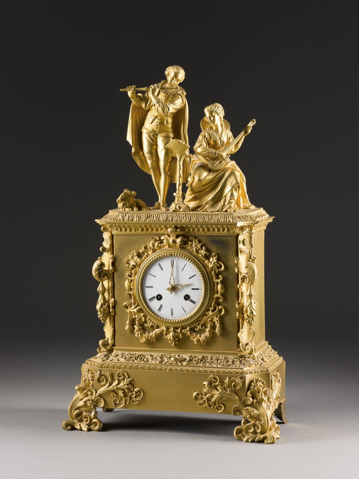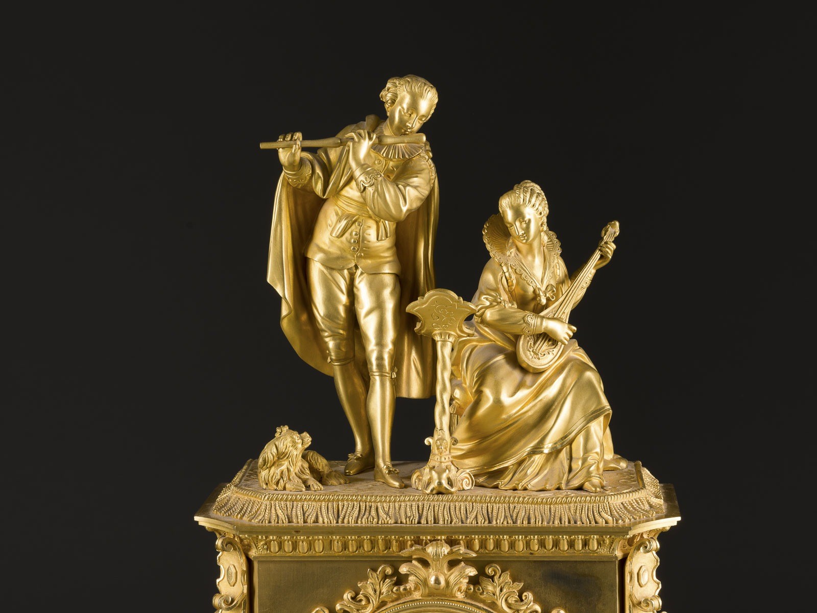 Metallguss, vergoldet, Stahl, Email. 52 x 31 x 15 cm. Auf dem Werk bez. 'Roblin à Paris'. Floral verzierter Korpus mit vollplstischem, musizierendem Paar und Hund. Weißes,