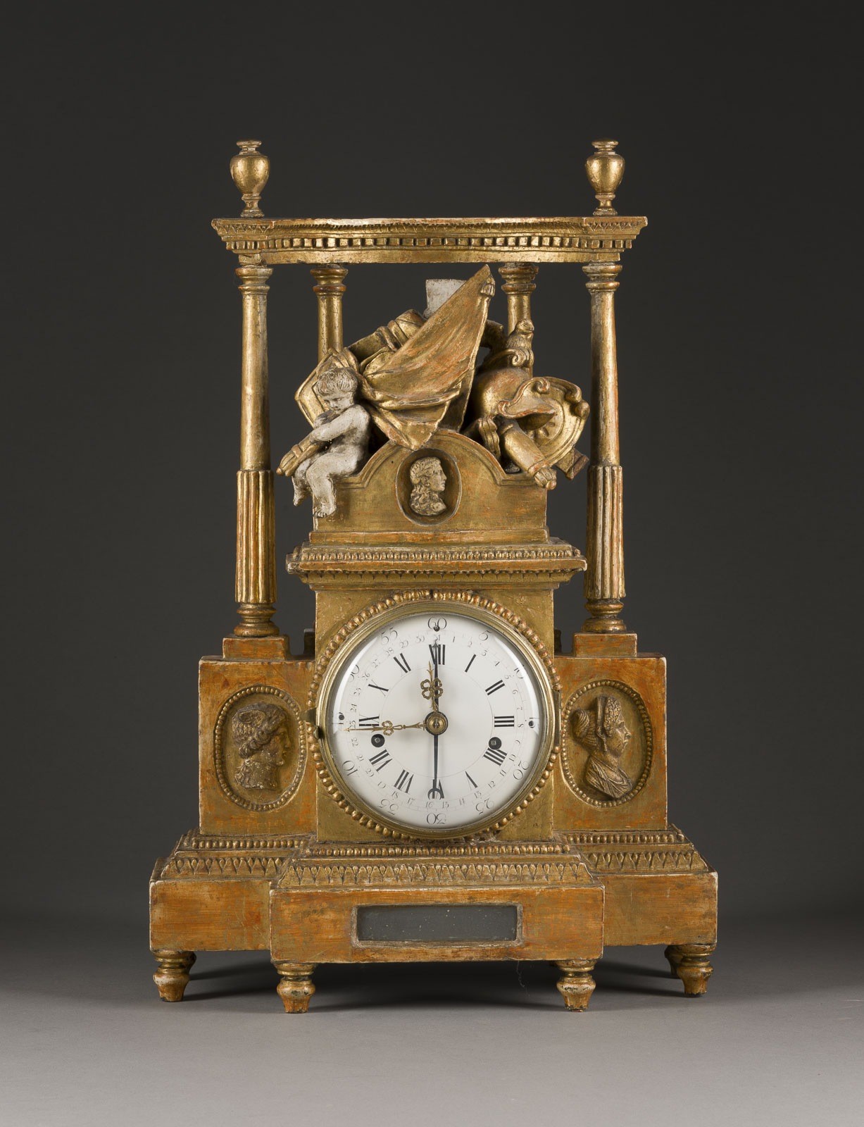 bekrönt von Säulen und Putto mit Kriegsattributen. Weißes, emailliertes Zifferblatt mit