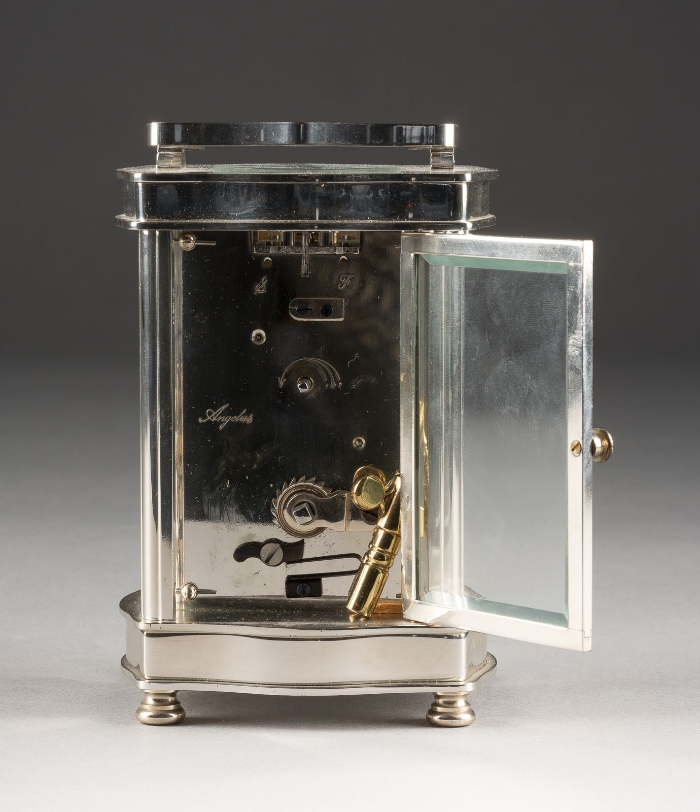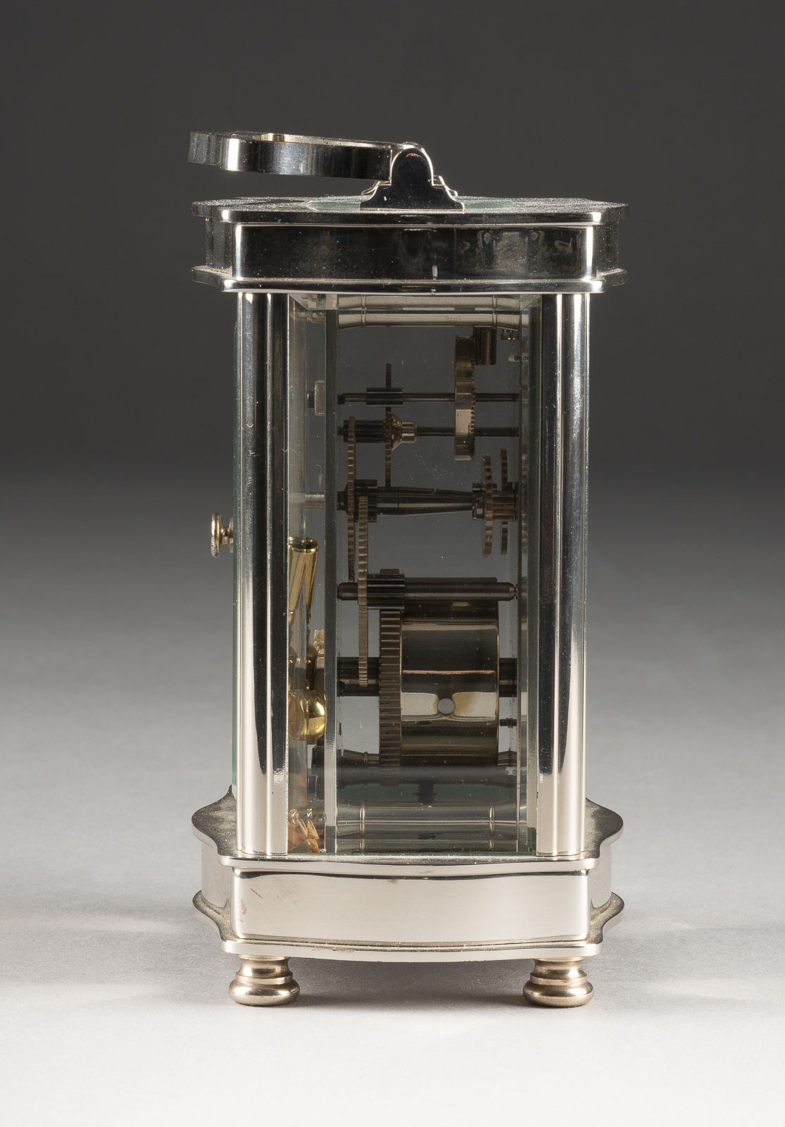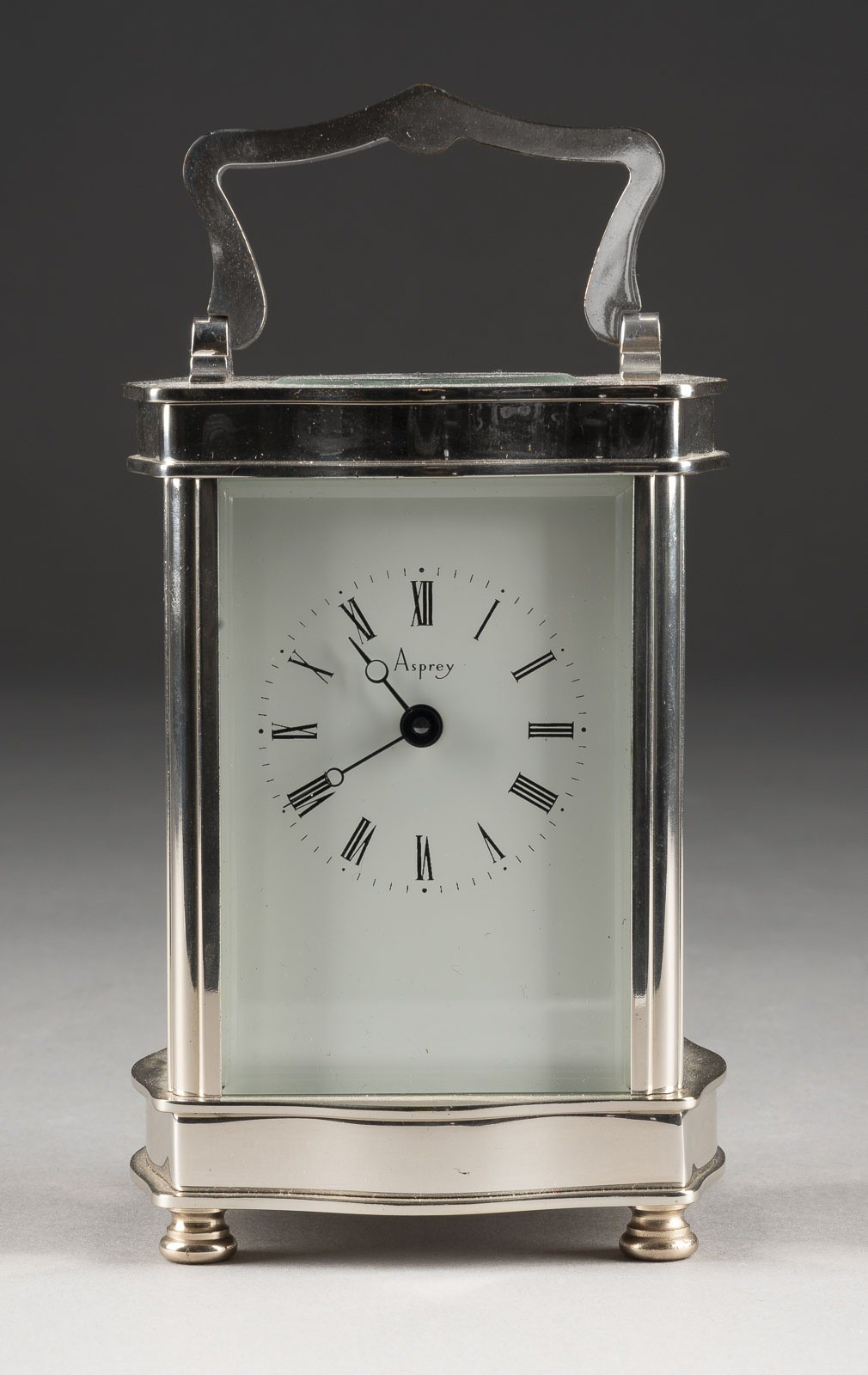 Metall, Glas, Stahl. 12 x 8,5 x 7 cm (ohne Griff). Auf dem Zifferbaltt bez. 'Asprey'. Allseitig verglaster Korpus mit Tragegriff und weißem Zifferblatt mit römischen Zahlen und