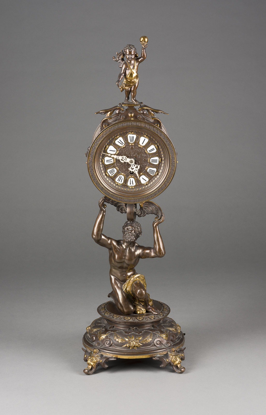 Metallguss, part. vergoldet, Metall, Email. Stahl. Ca. 68 x 22 x 22 cm. Auf dem Werk bez. 'Gustav Becker Freiburg', 'Medaille d'or' sowie Nr. '536422'. Auf Löwenkopffüßen gewölbter, verzierter Rundfuß mit Figur eines knienden Mannes, ein