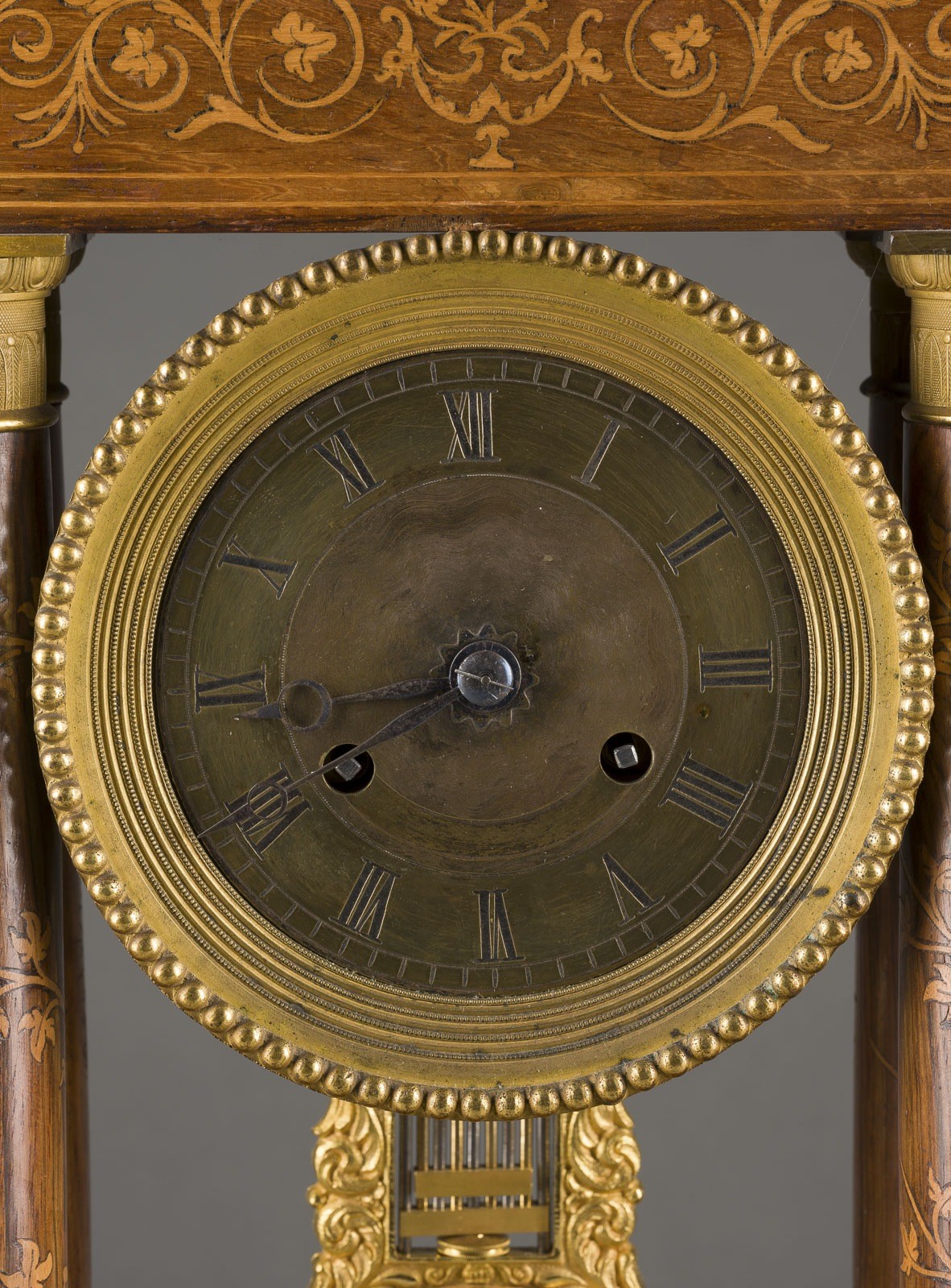 Perlfries umgebenes Messingziffernblatt mit gravierten römischen Zahlen. Gebläute