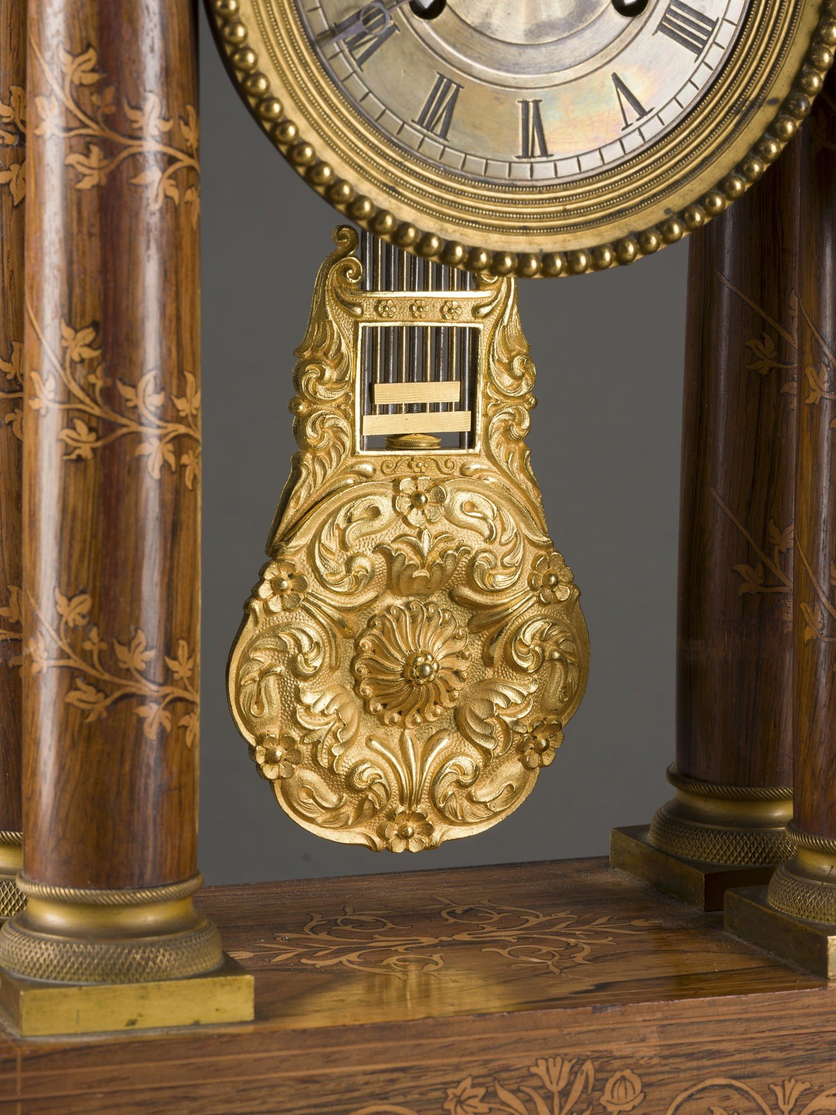 Säulen mit Messingkapitellen und -basen. Gestuftes, floral verziertes Gesims. Mit
