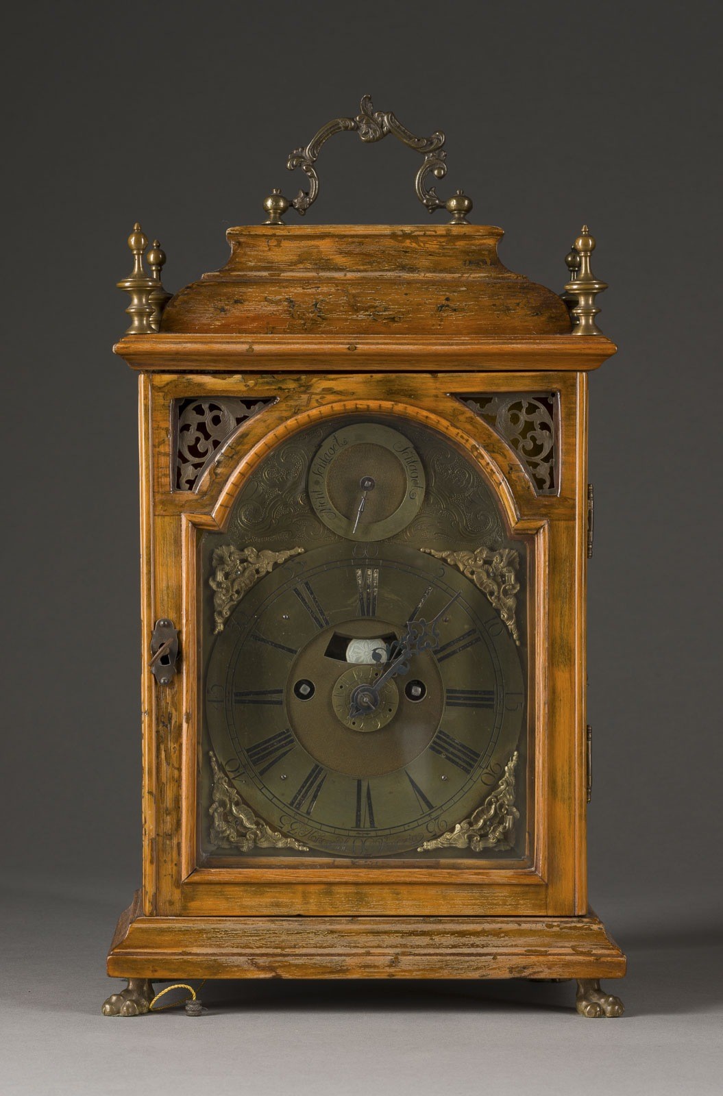 Schallloch, gestuftem Giebel, Eckverzierungen und Tragegriff. Messingwerk mit Schlag auf