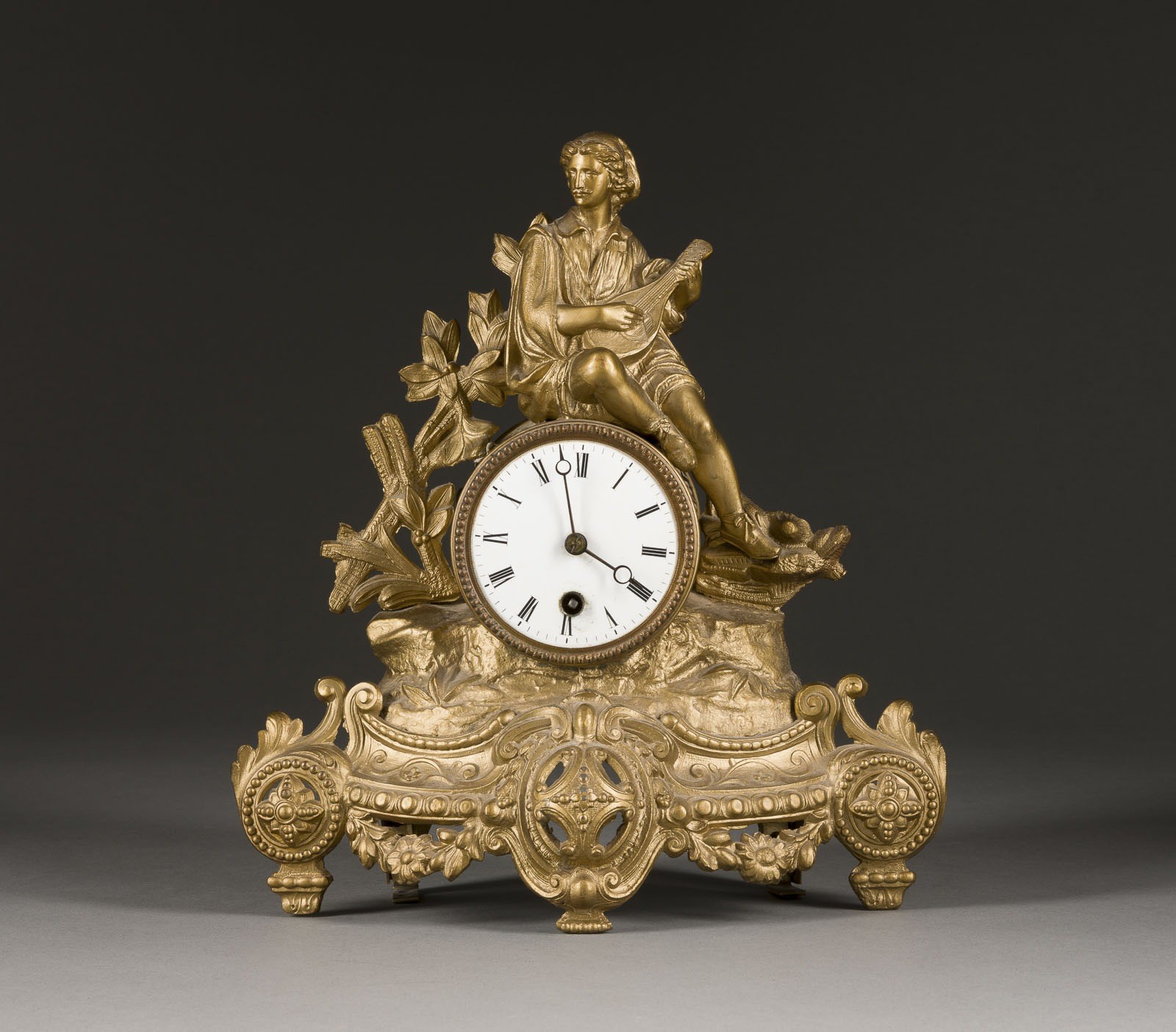 Bronzierter Metall- oder Zinkguss, Email, Stahl. 30 x 27 x 11 cm. Über reich verziertem Sockel mit Floraldekor plastische Figur eines Lautespielers. Weißes,