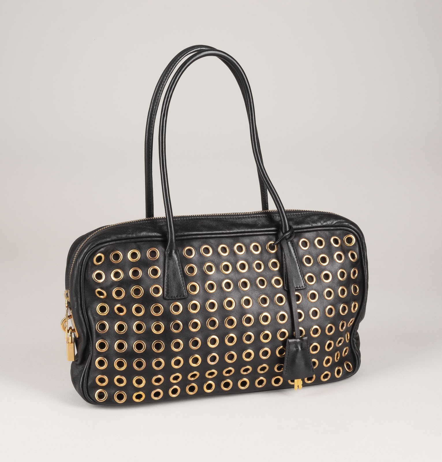 Schwarzes Leder, goldfarbene Hardware, schwarzer 'Prada'-Logo-Stoff. L. 32 H. 37 B. 6 cm. An der Seite Triangolo-Logo 'Prada Milano', innen Plakette 'Prada Made in Italy' sowie Etikett mit der Nr. '117'. Die Doppelgrifftasche mit den ikonischen Ösen, einem Schloss und zwei Schlüsseln.